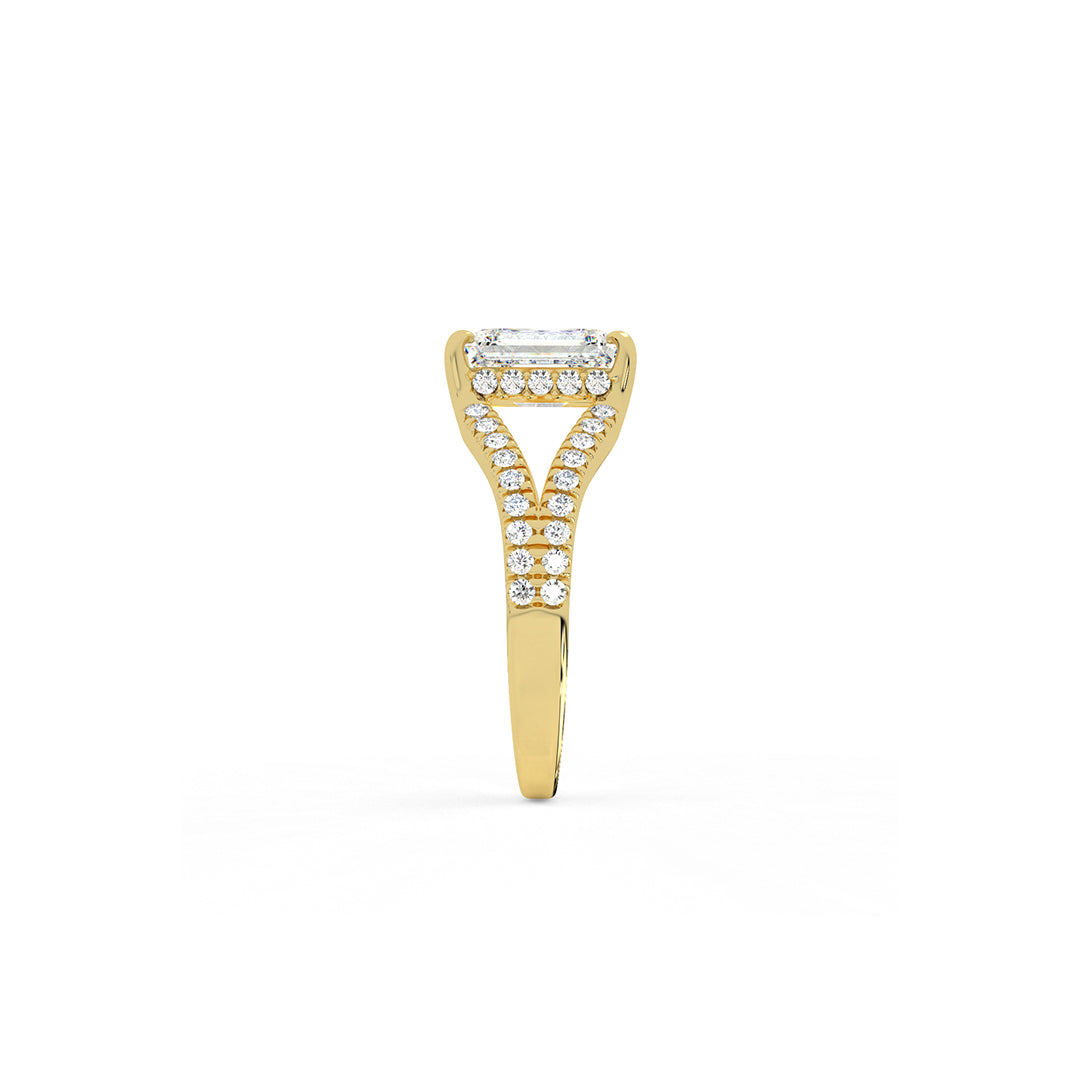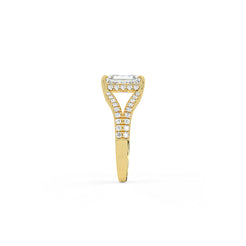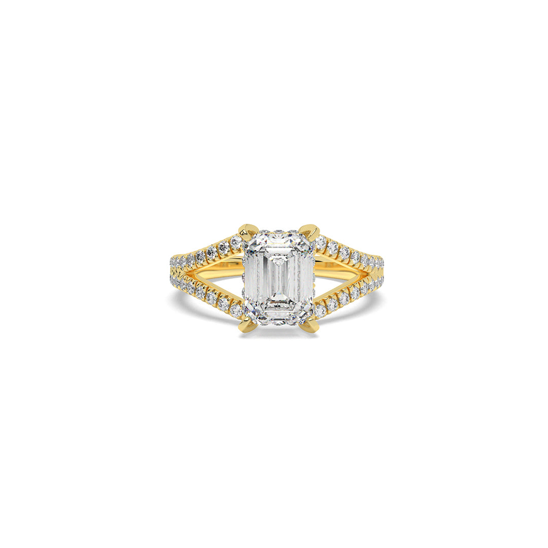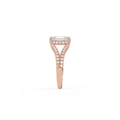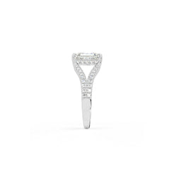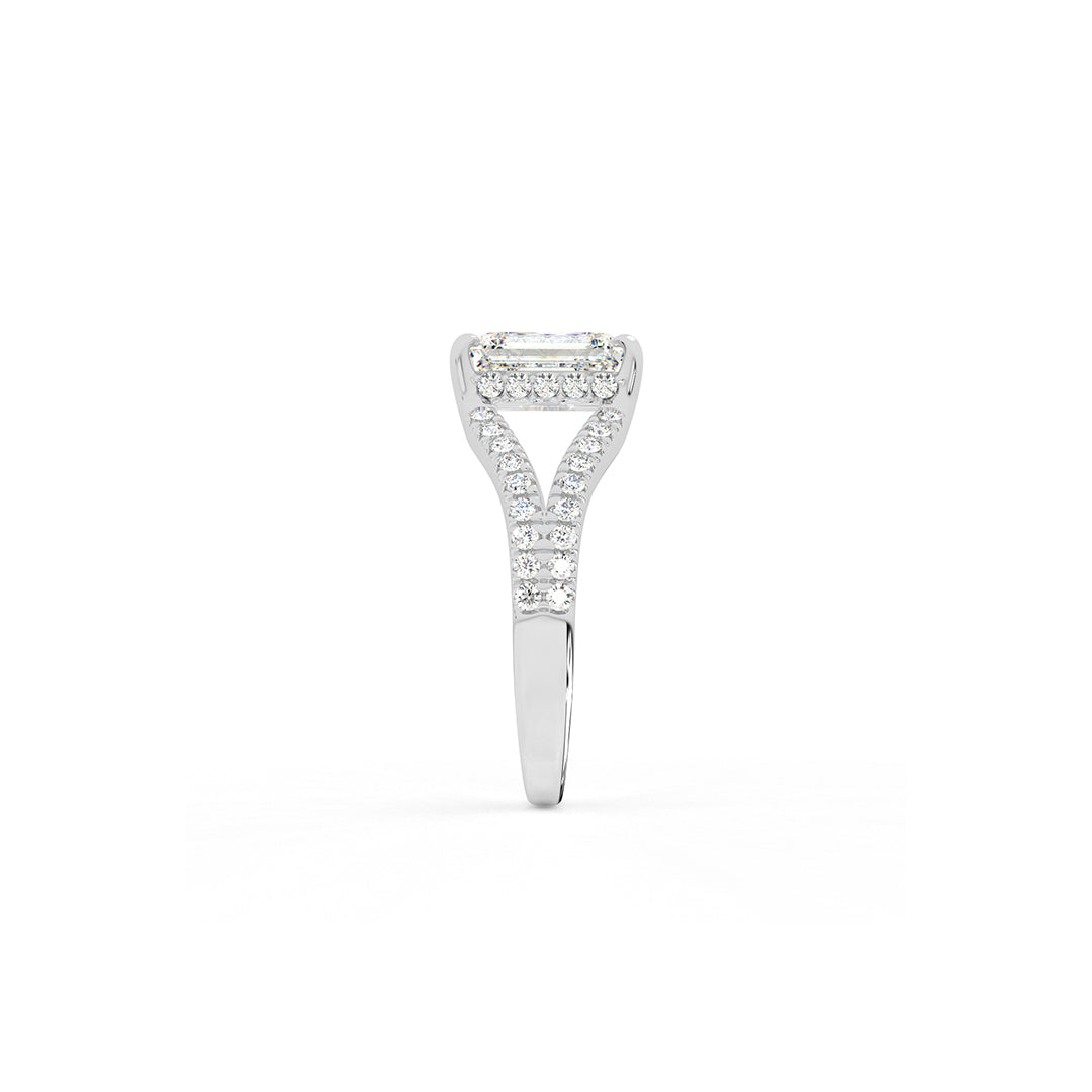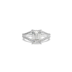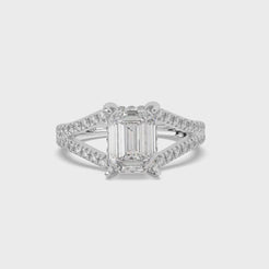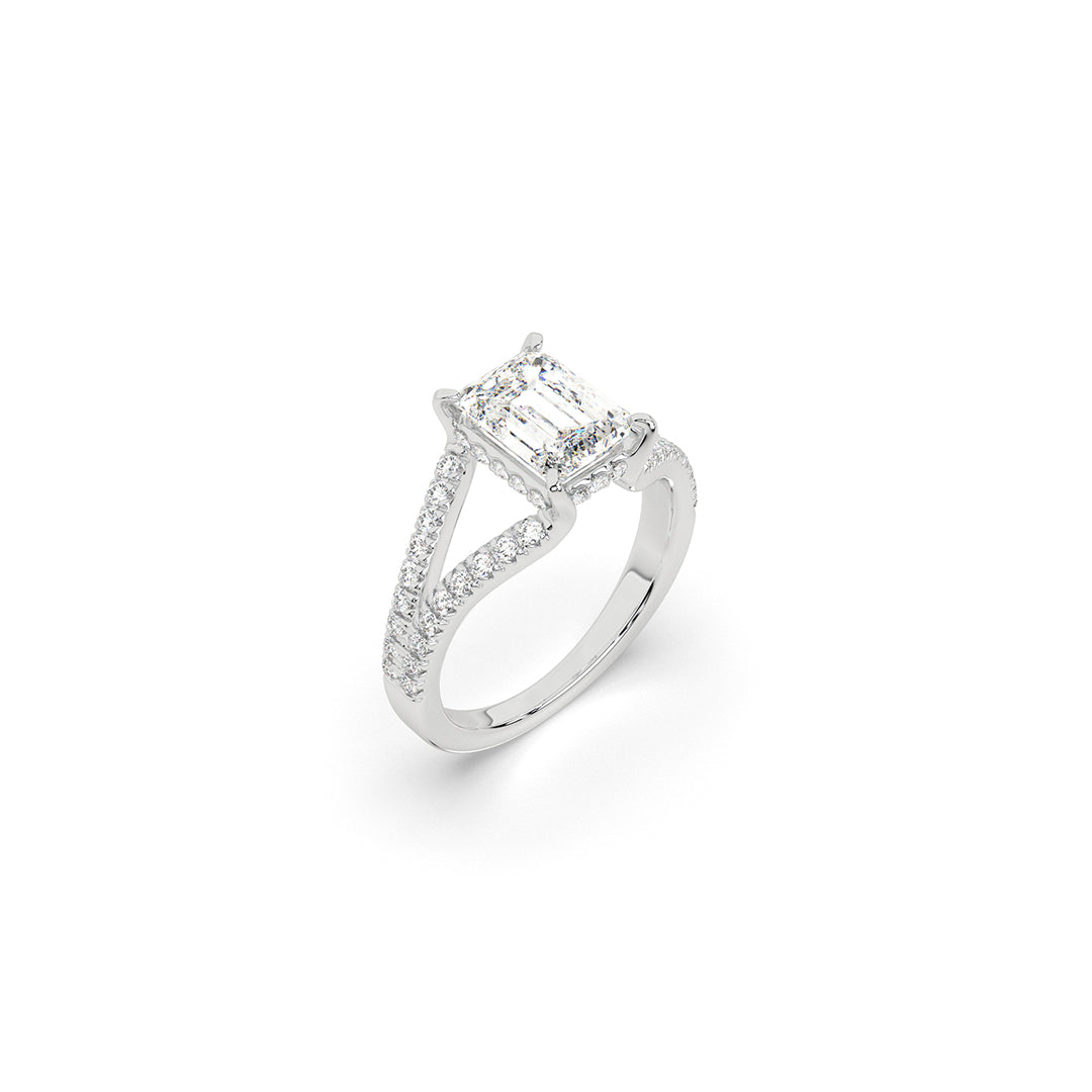 A stunning 1.6 ct emerald-cut diamond, beautifully highlighted by a split shank pavé band that sparkles with radiant ...