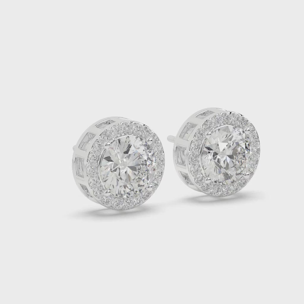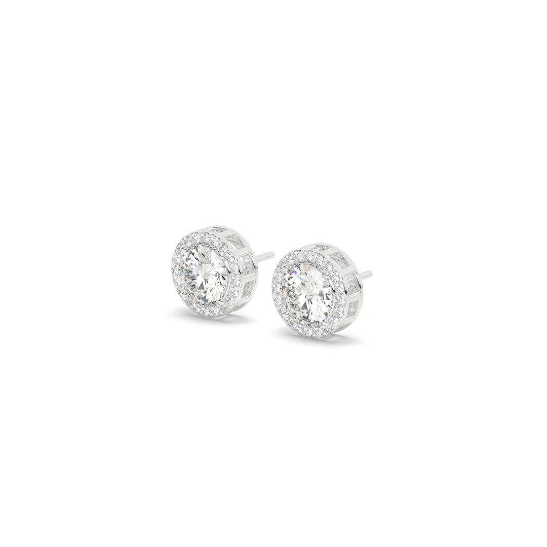 Round brilliant diamonds radiate from a micropave halo, capturing a gentle luminosity around each ear. A flawless fus...