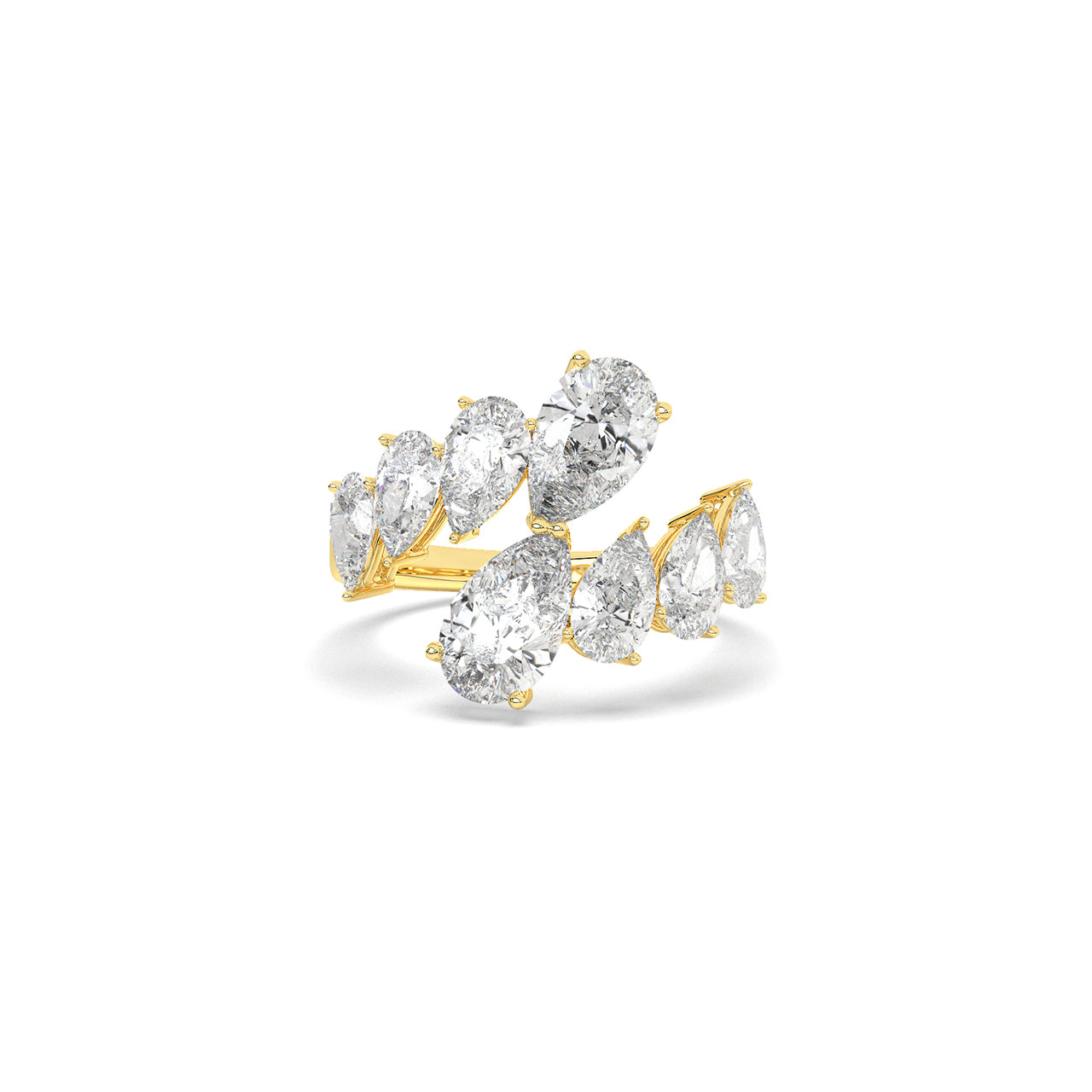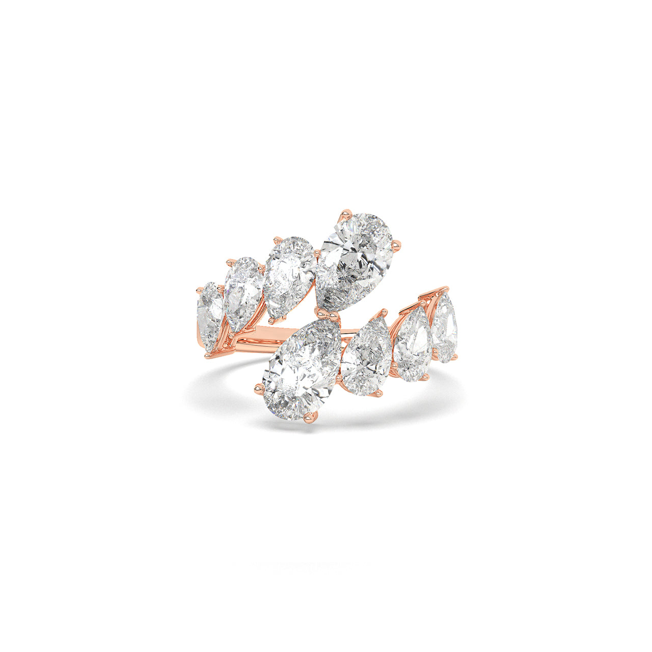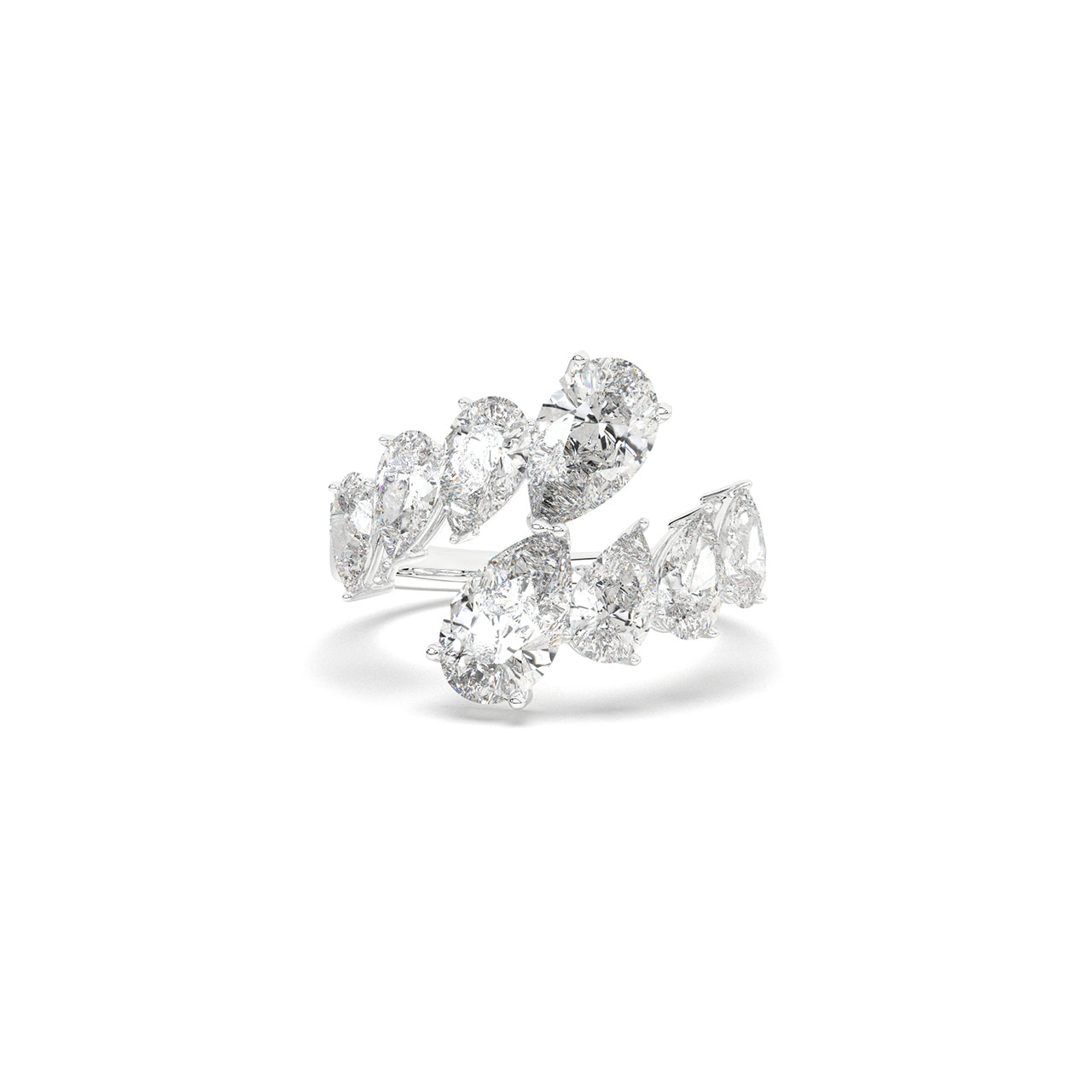 An open band bursts with a graduated sequence of pear-shaped diamonds, rising like twin arcs of flickering flame. Thi...