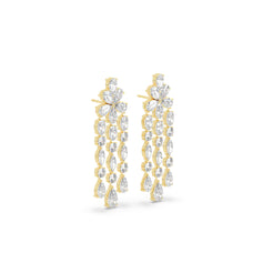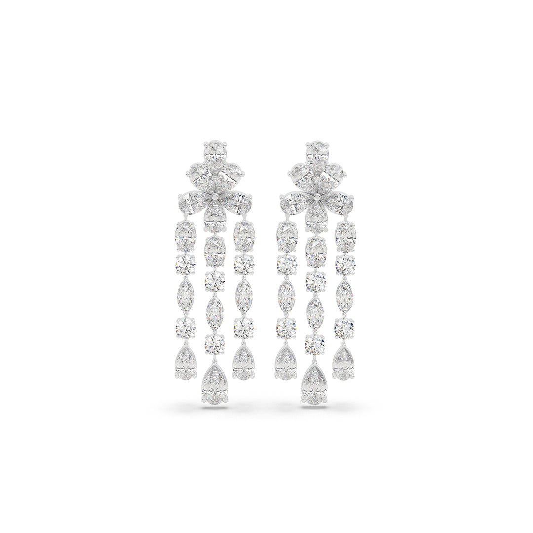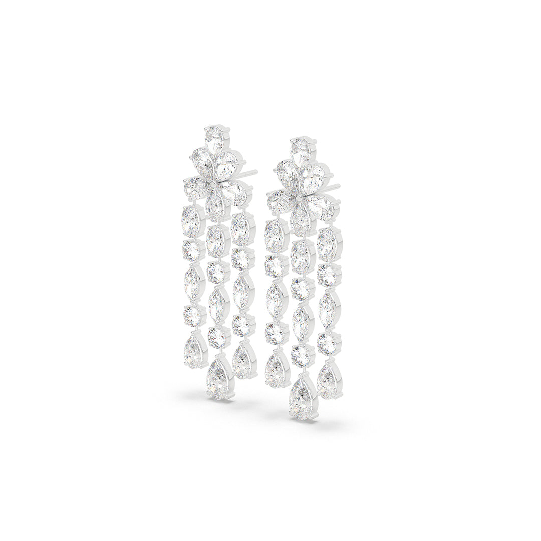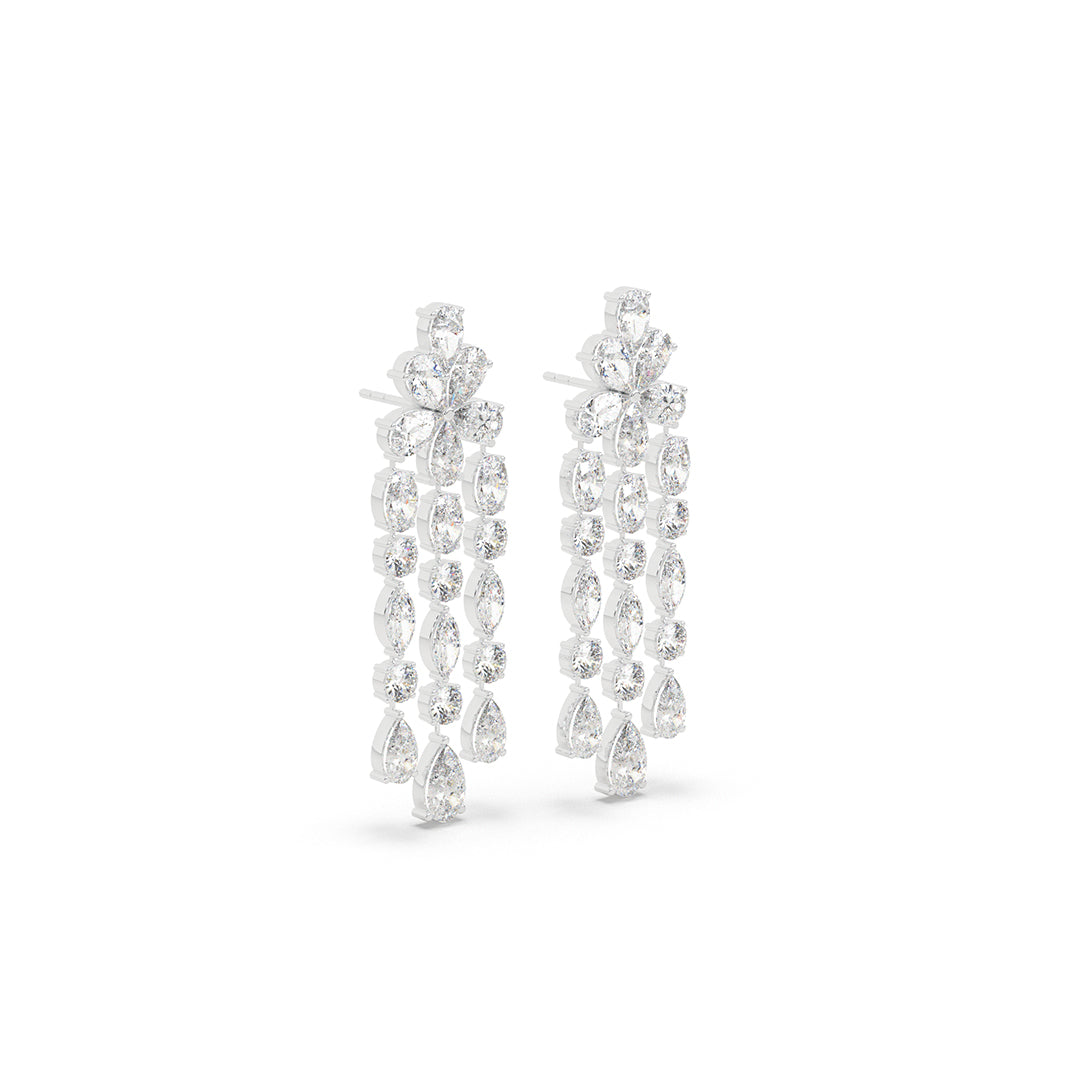 Multi-strand diamond drops flow in a chandelier design, reminiscent of sparkling raindrops in motion. A statement of airy elegance and gentle glamour.