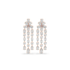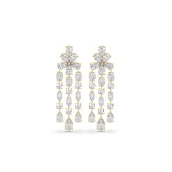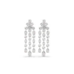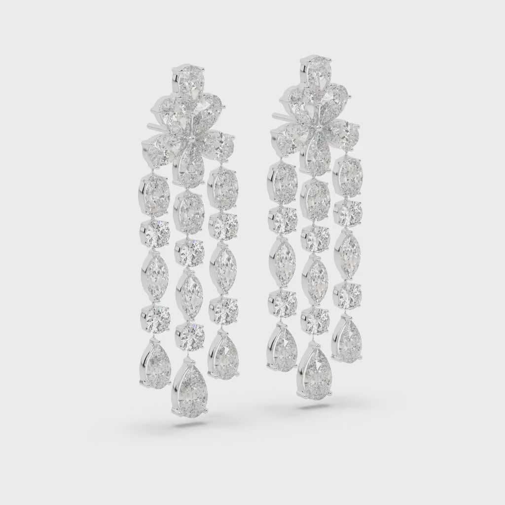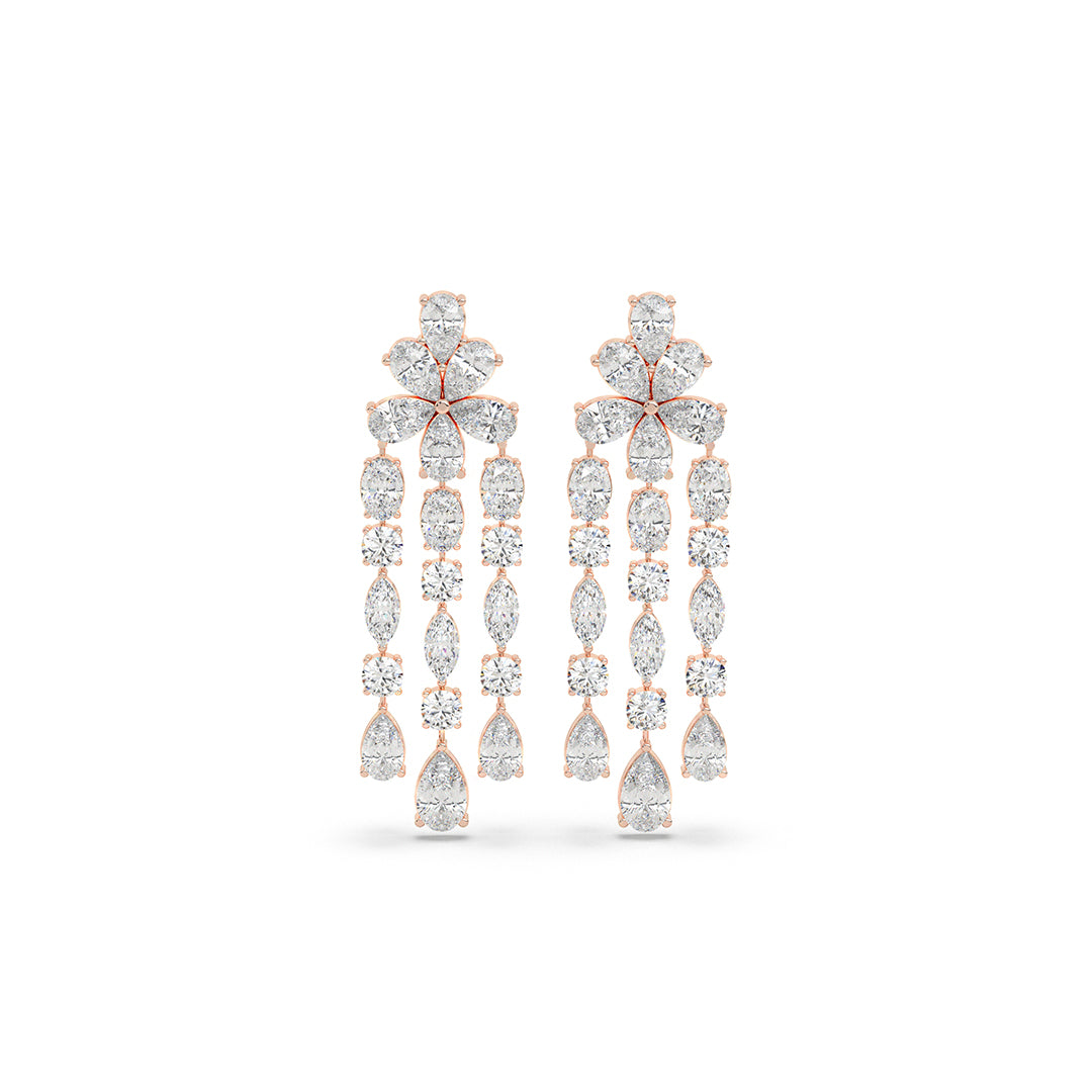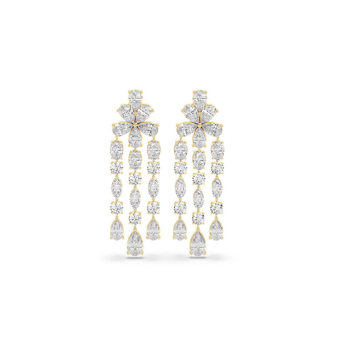 Multi-strand diamond drops flow in a chandelier design, reminiscent of sparkling raindrops in motion. A statement of airy elegance and gentle glamour.