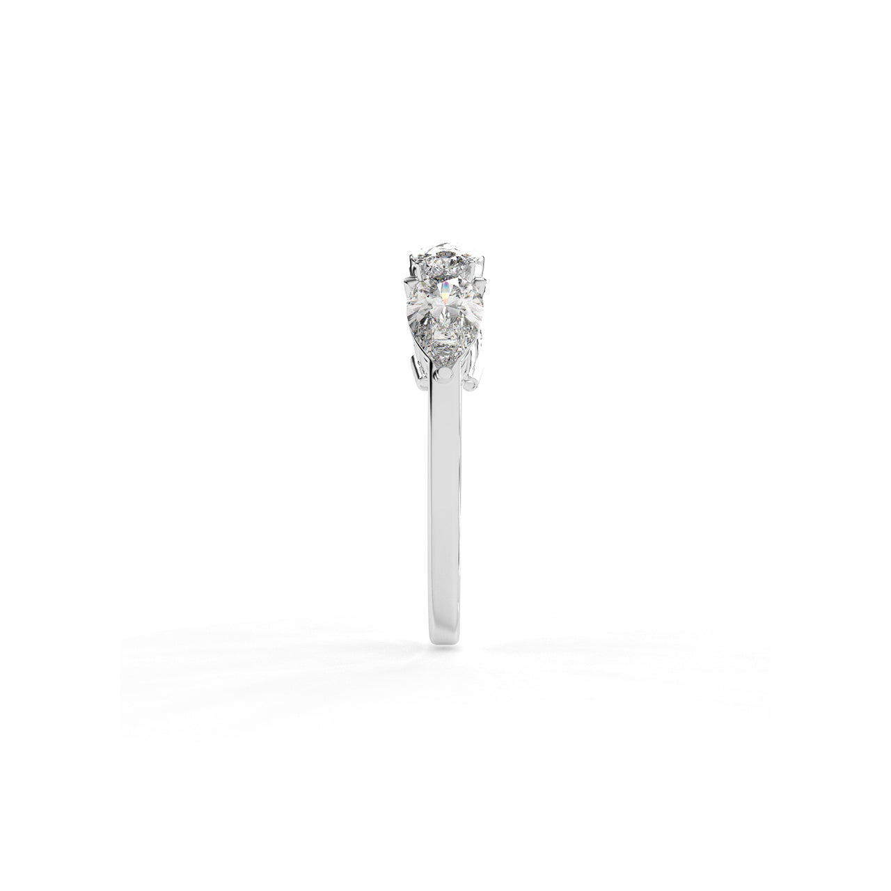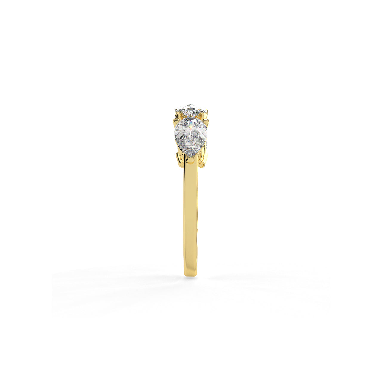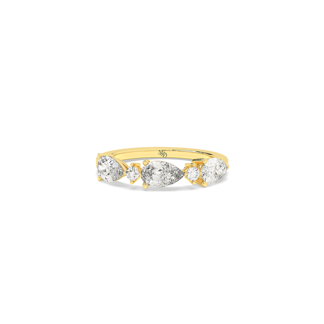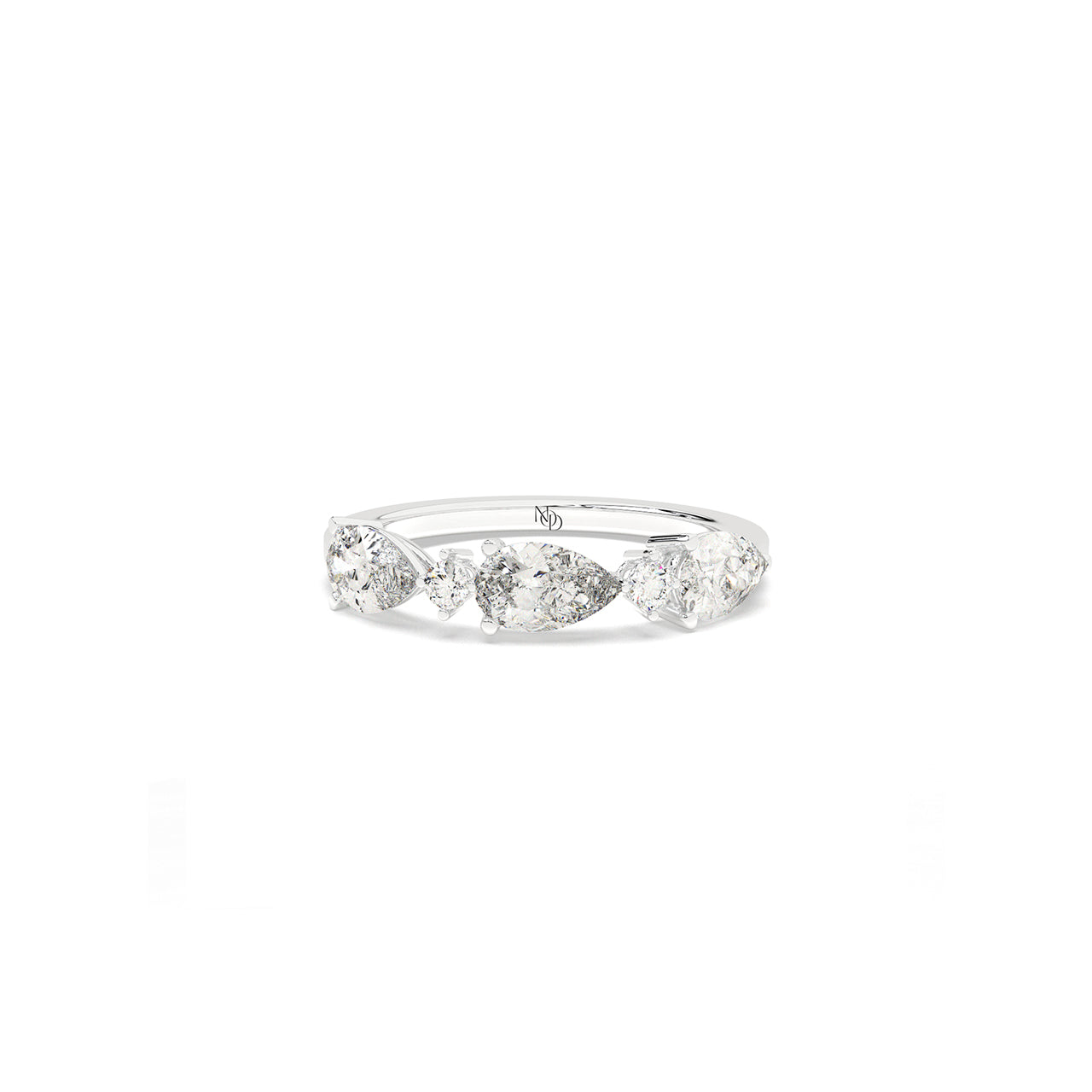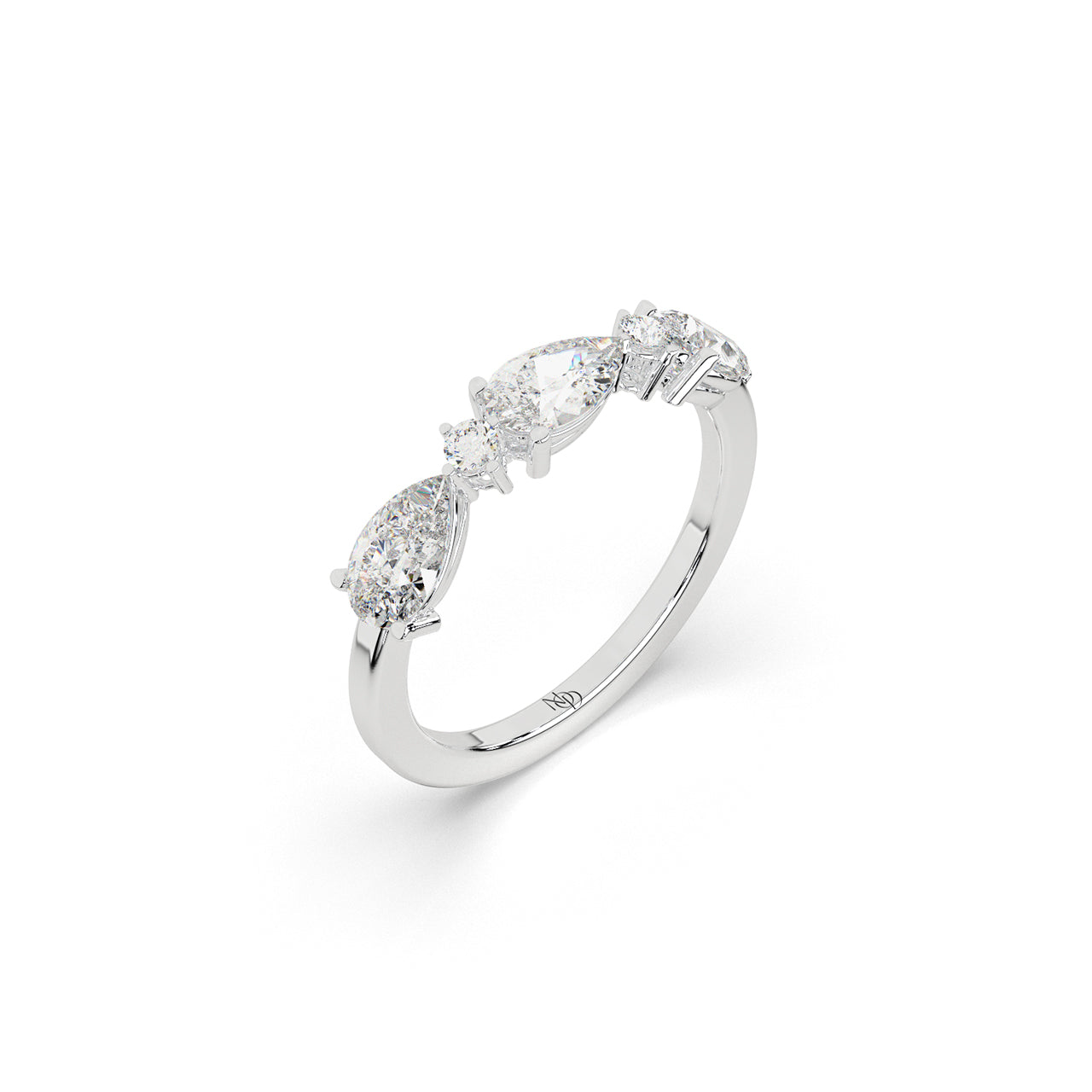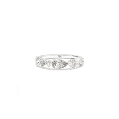 A graceful arrangement of pear and round brilliant diamonds dances across this five-stone band. With alternating shap...