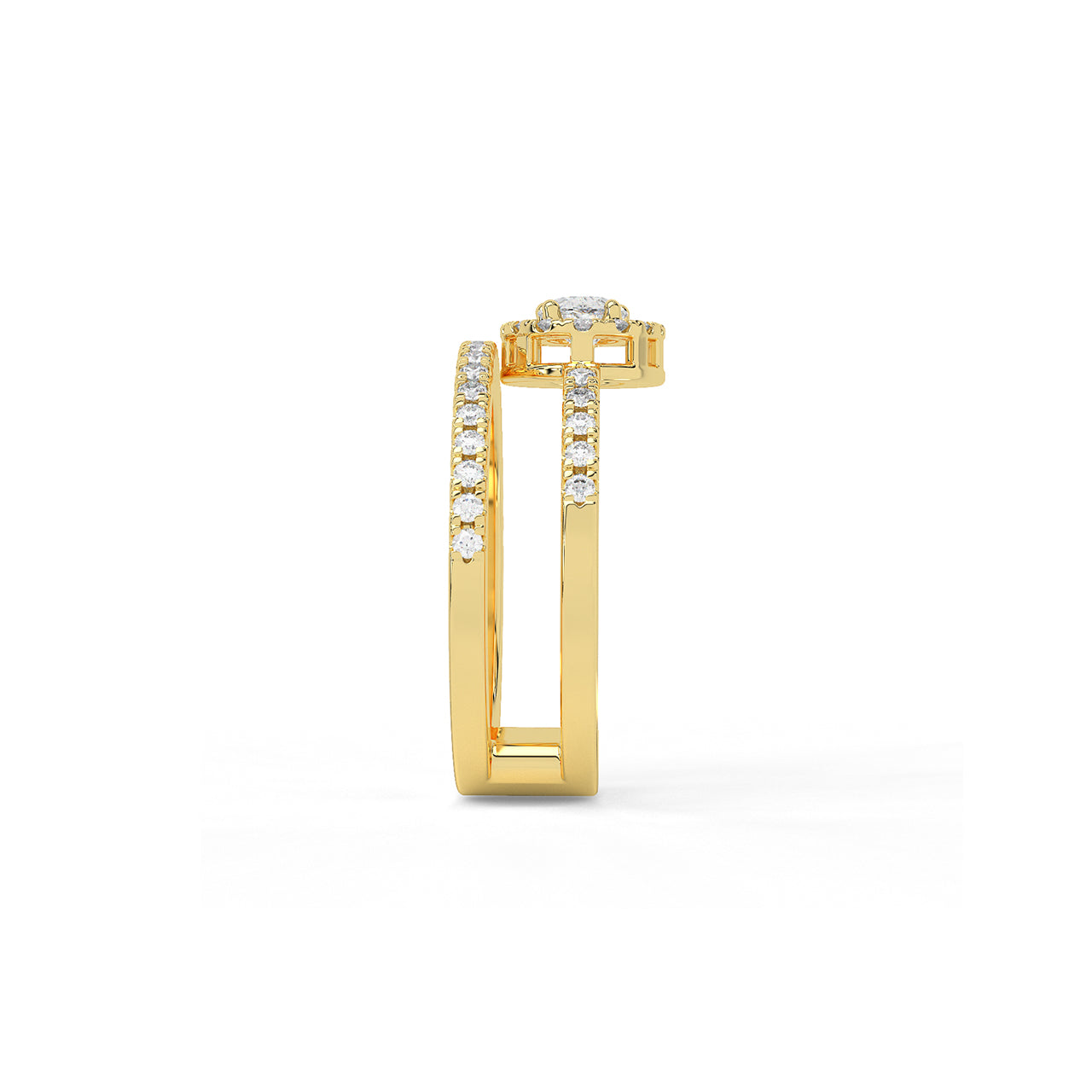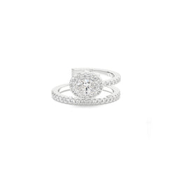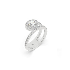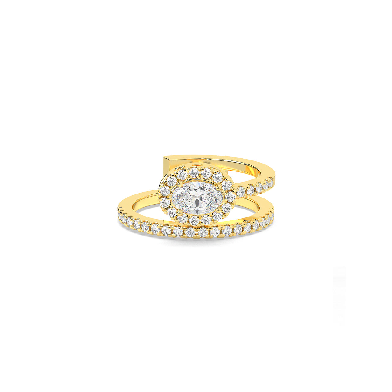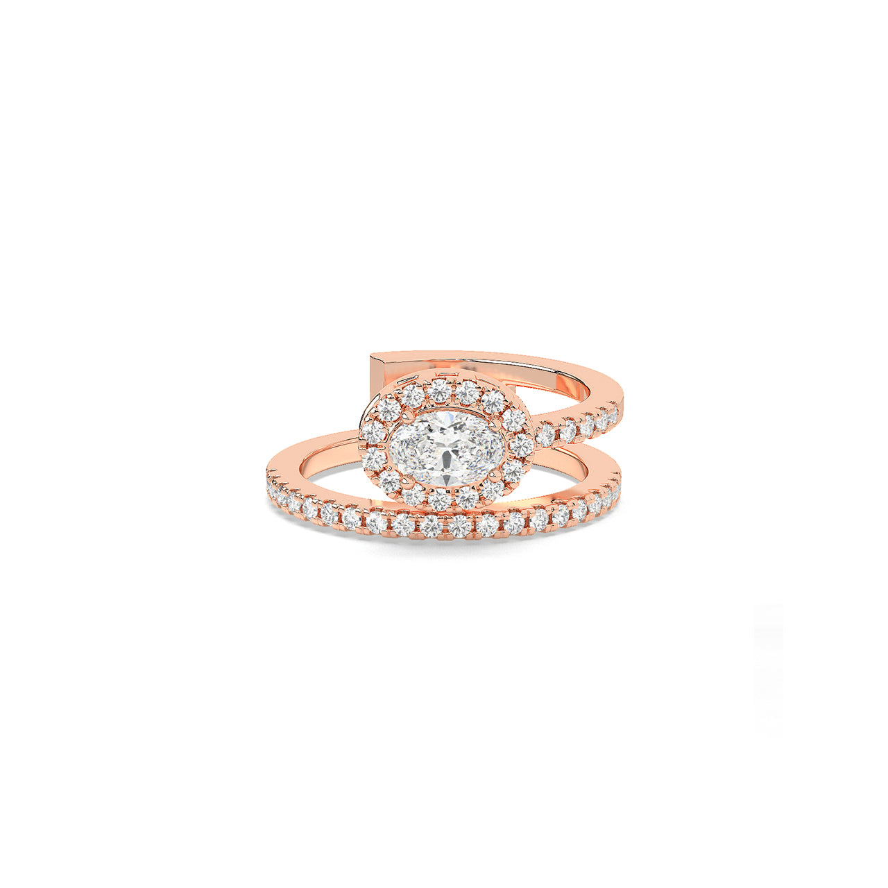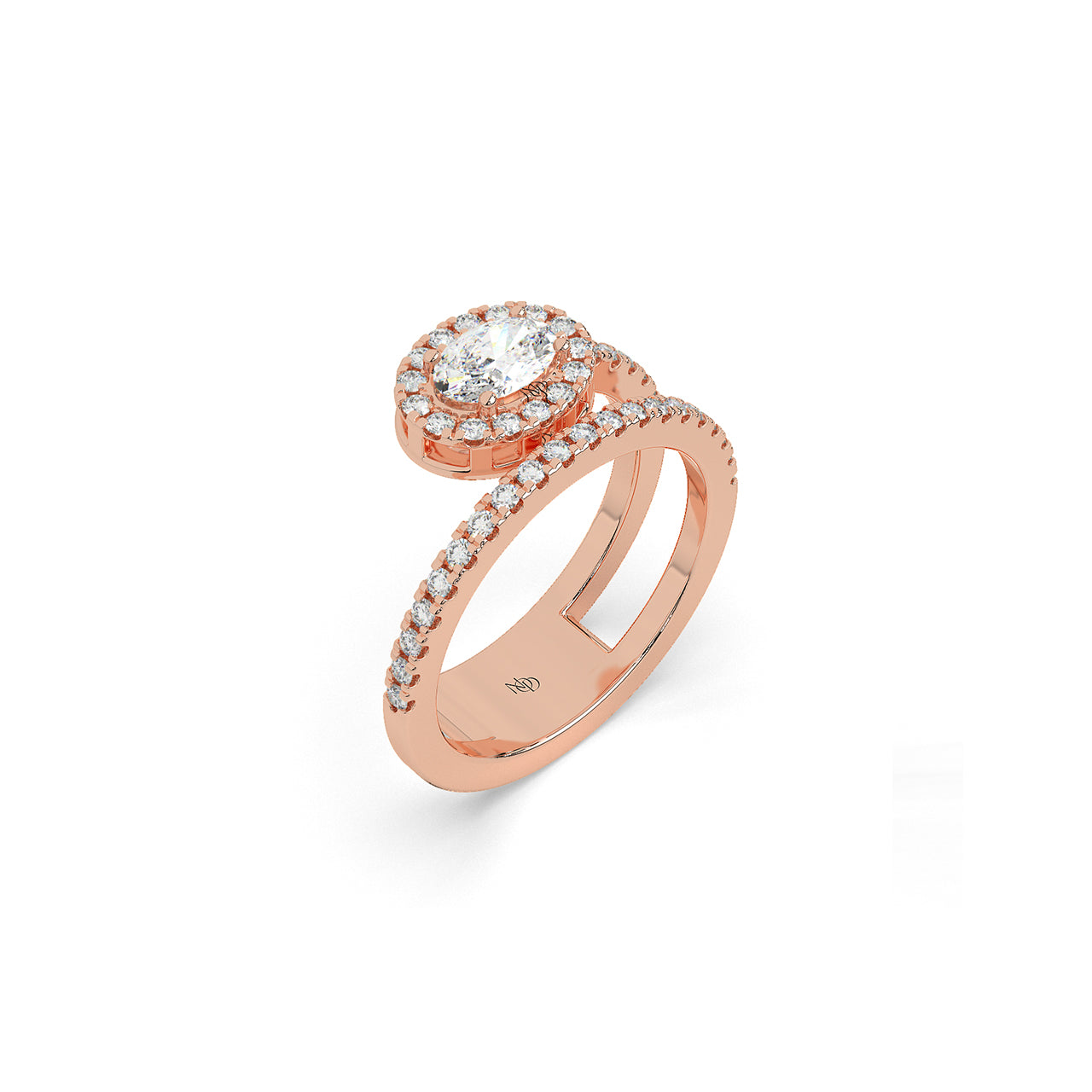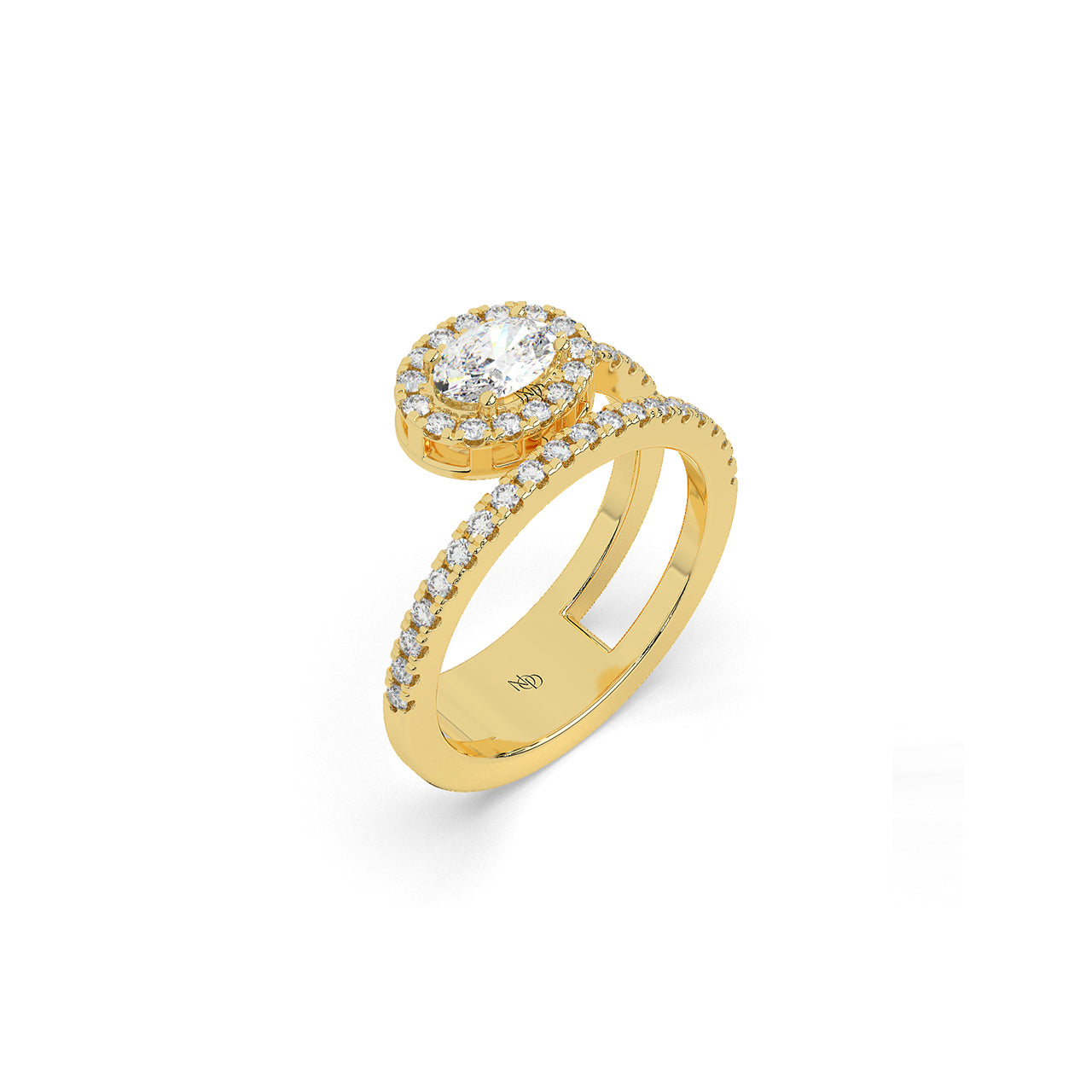 Two elegant bands curve gracefully around a halo-set oval diamond, creating a wraparound silhouette that captures bot...