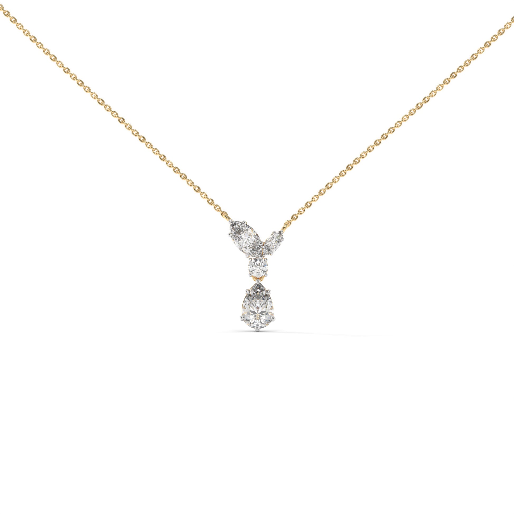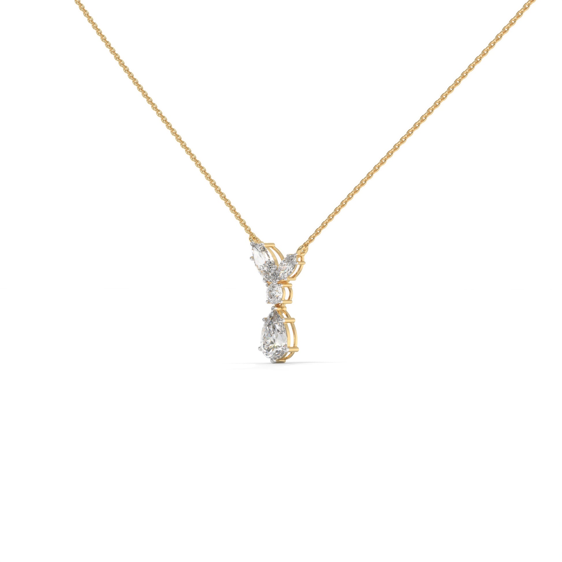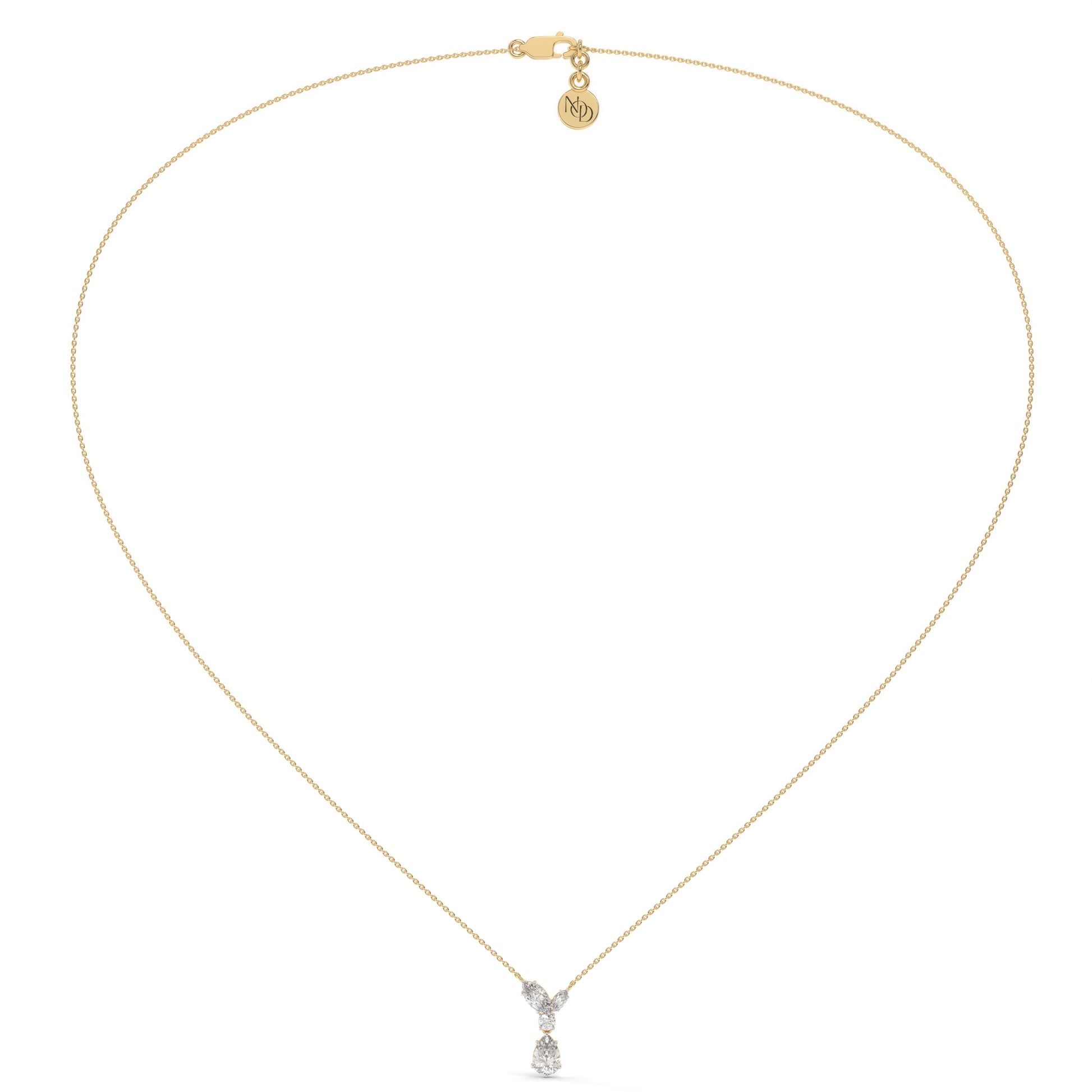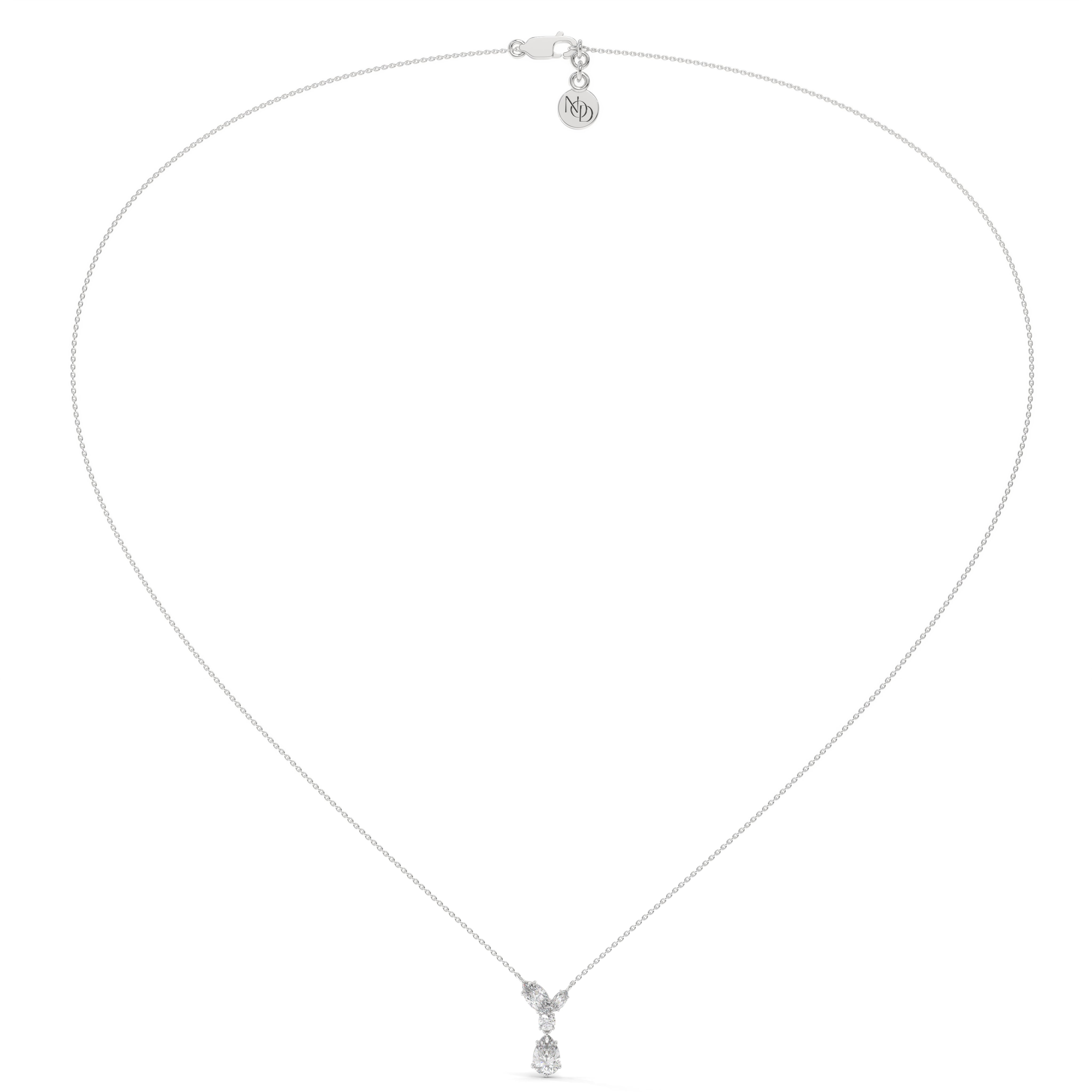 The Raya Pendant brings together a marquise-cut diamond on each side, a round-cut at the centre, and a pear-cut drop below — creating a seamless line of brilliance.