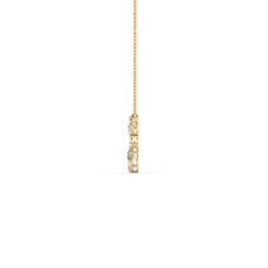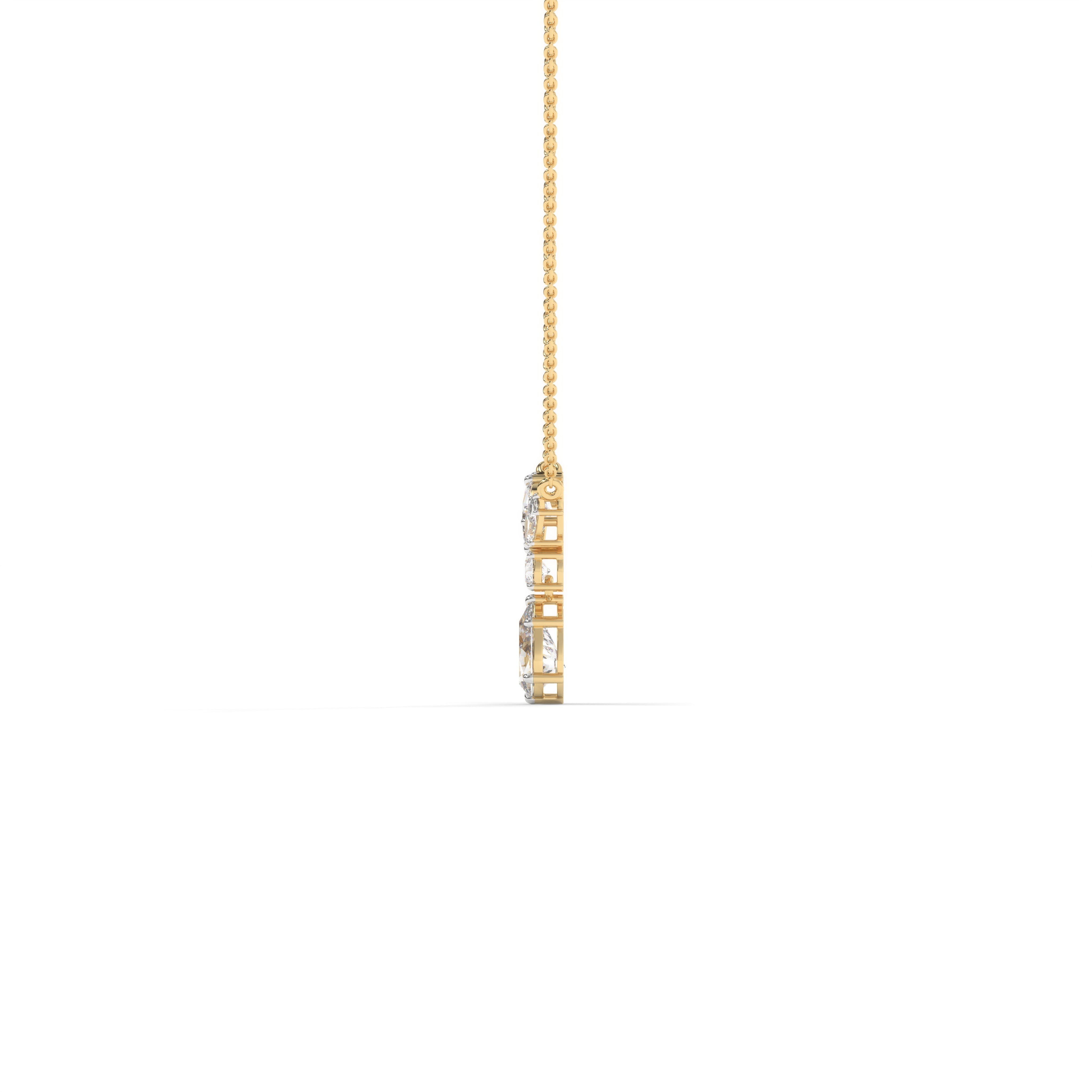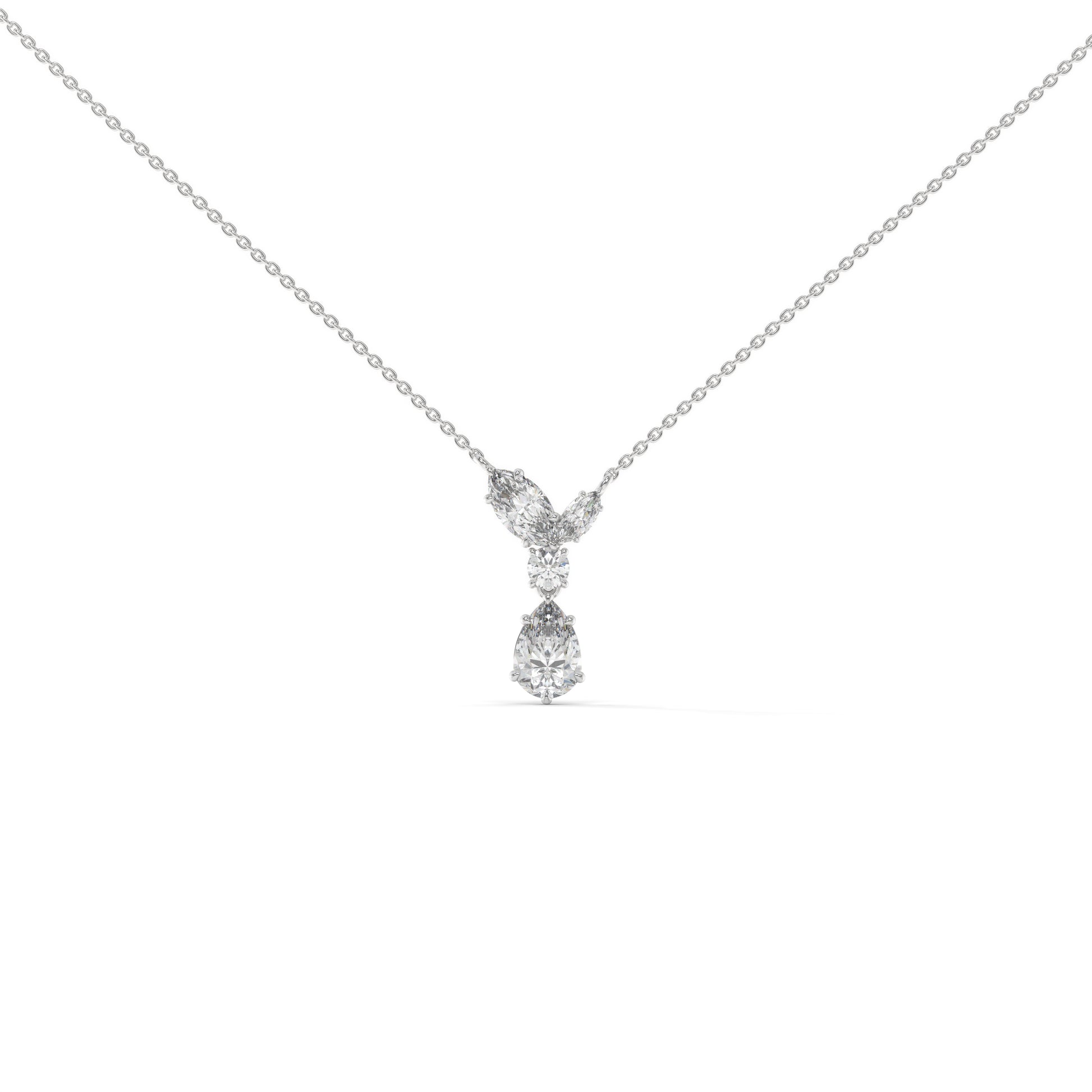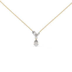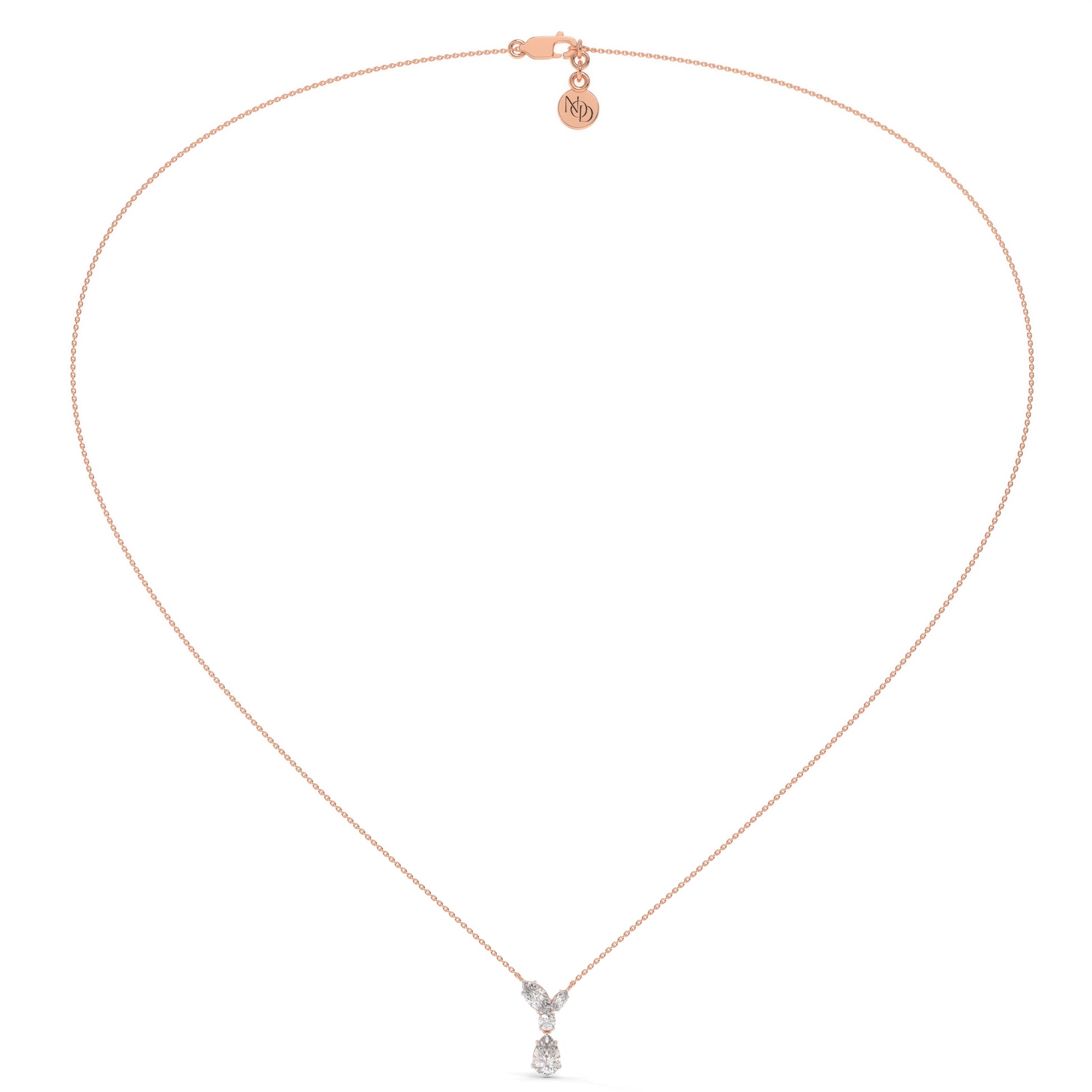 The Raya Pendant brings together a marquise-cut diamond on each side, a round-cut at the centre, and a pear-cut drop below — creating a seamless line of brilliance.