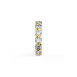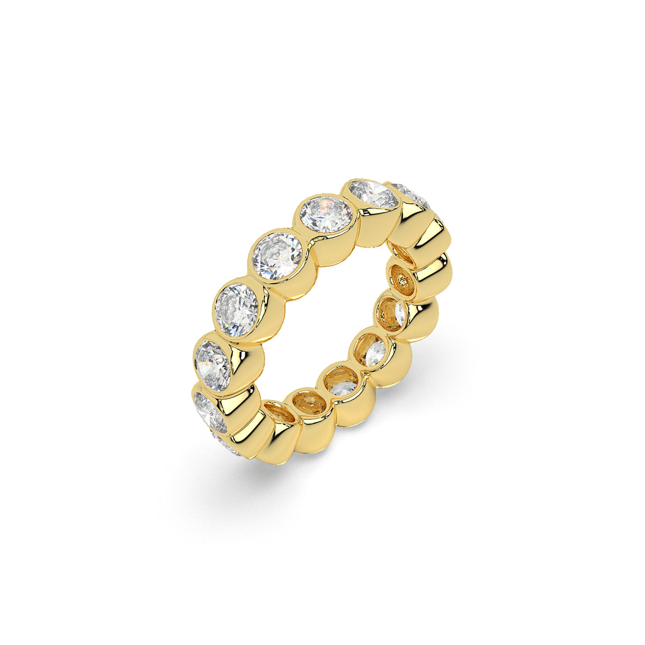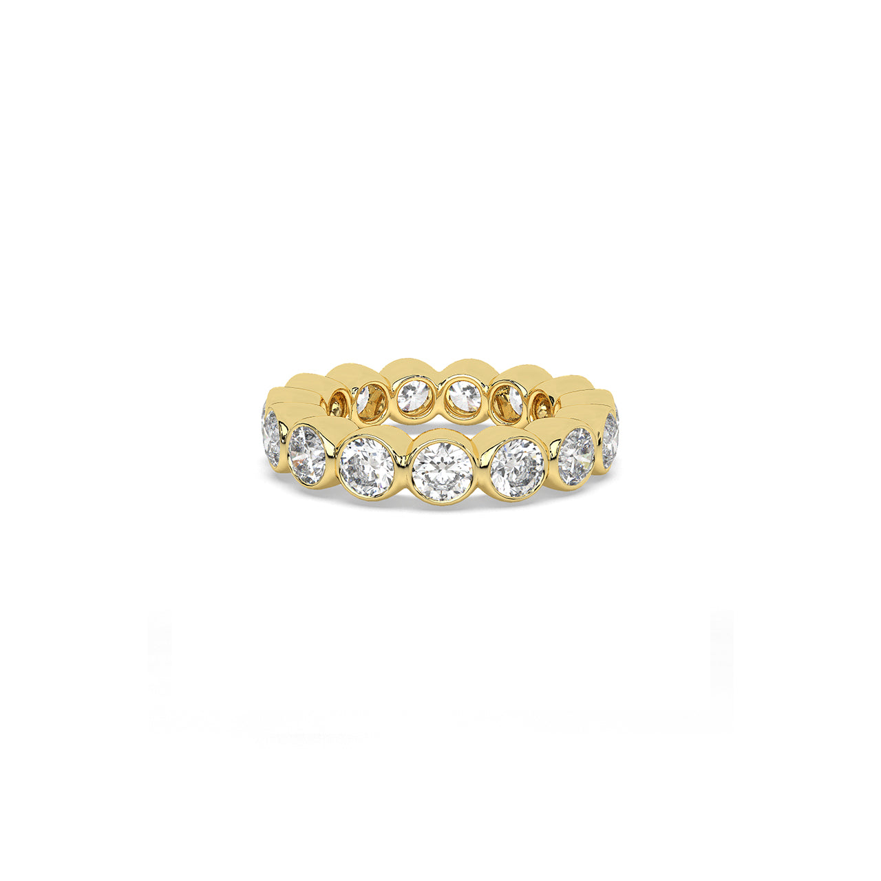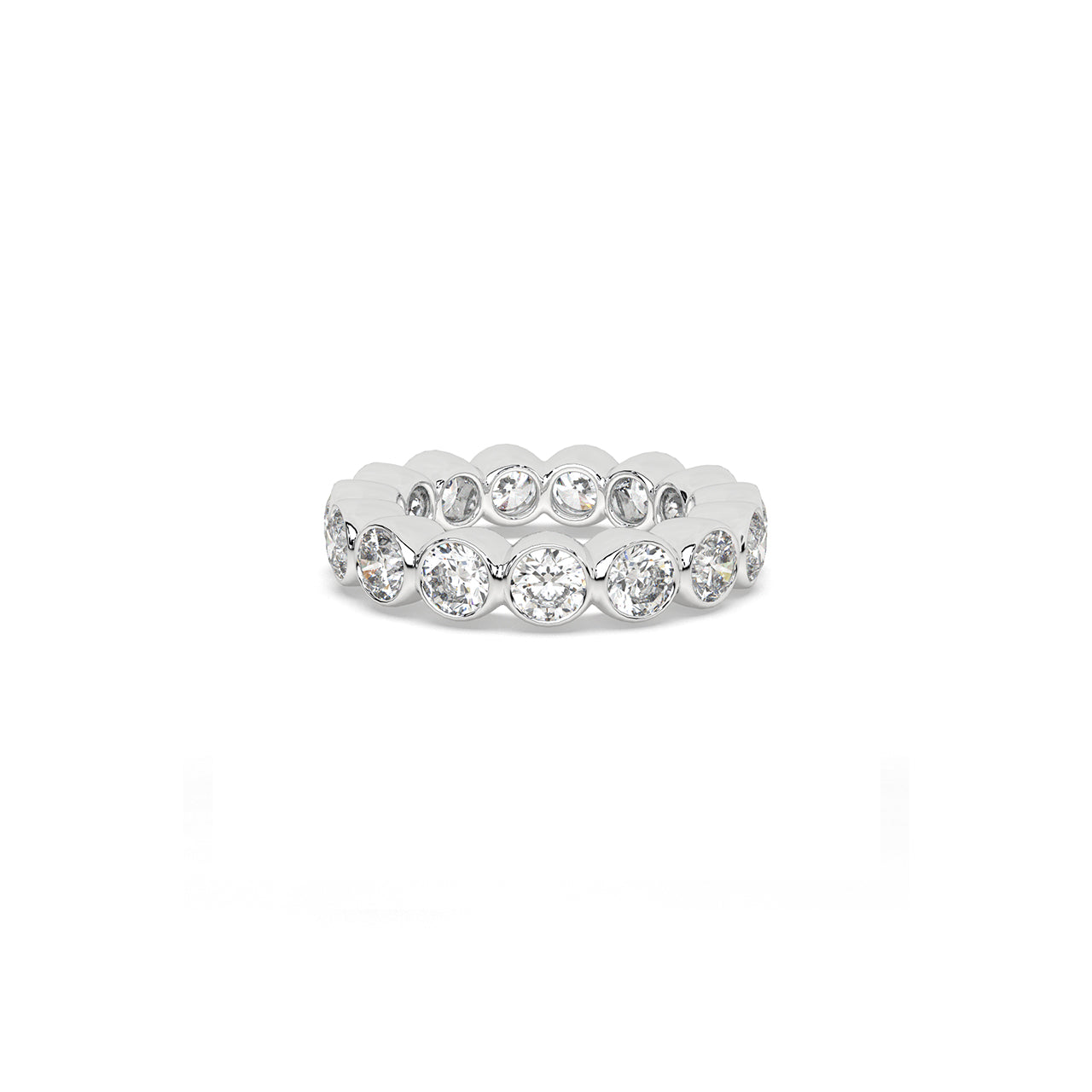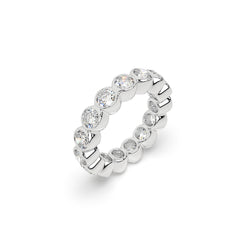 An endless ring of round diamonds, each framed in polished metal and curved to flow naturally into the next. The soft...