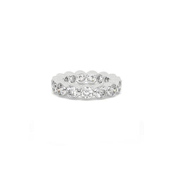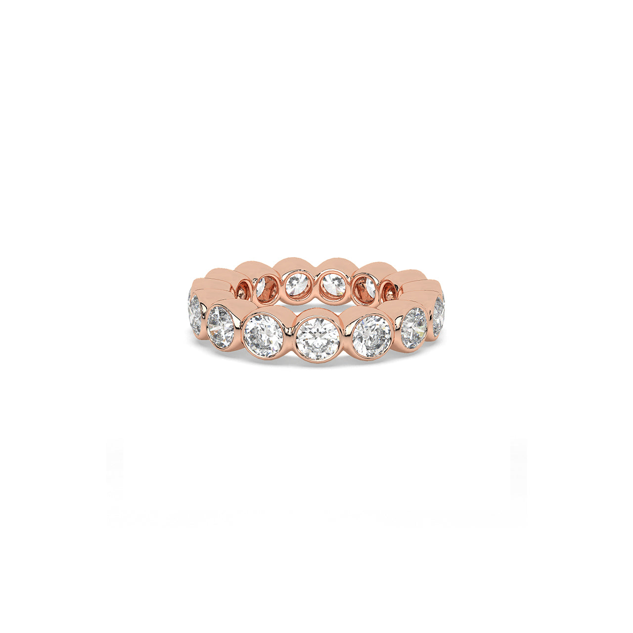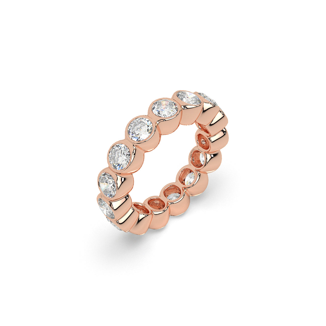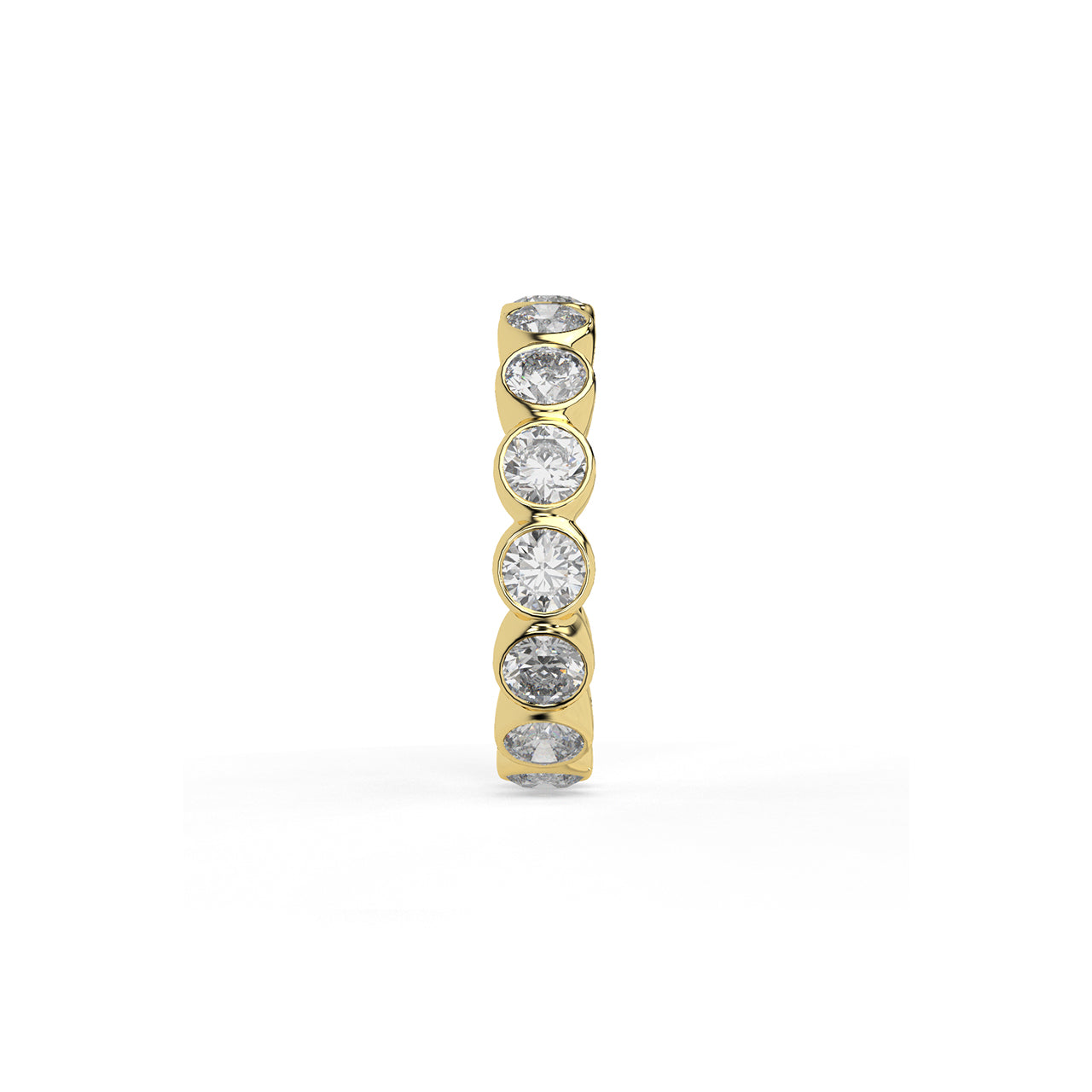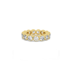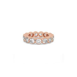 An endless ring of round diamonds, each framed in polished metal and curved to flow naturally into the next. The soft...