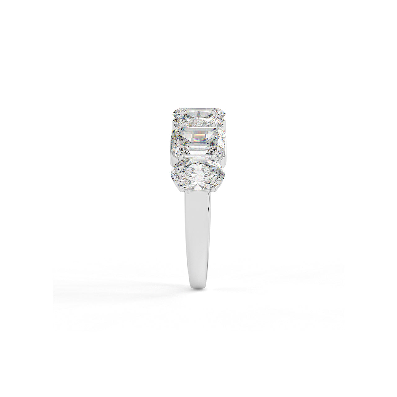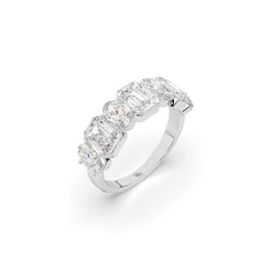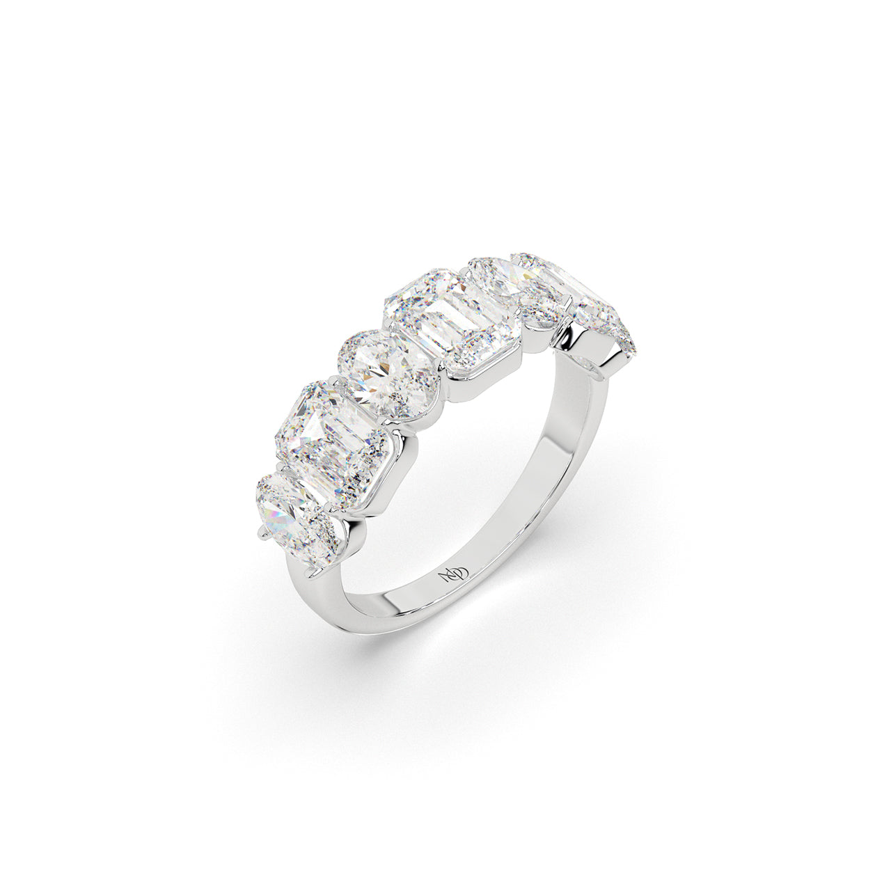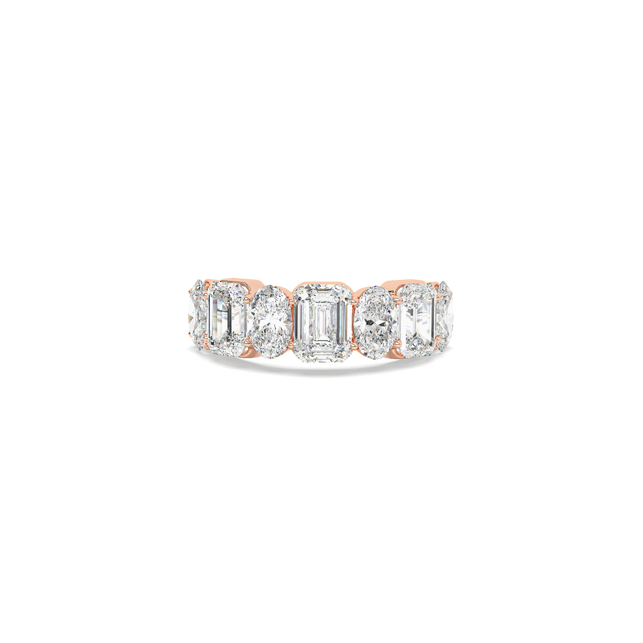A masterclass in balance, this band features a striking arrangement of emerald and oval cut diamonds in seamless succ...