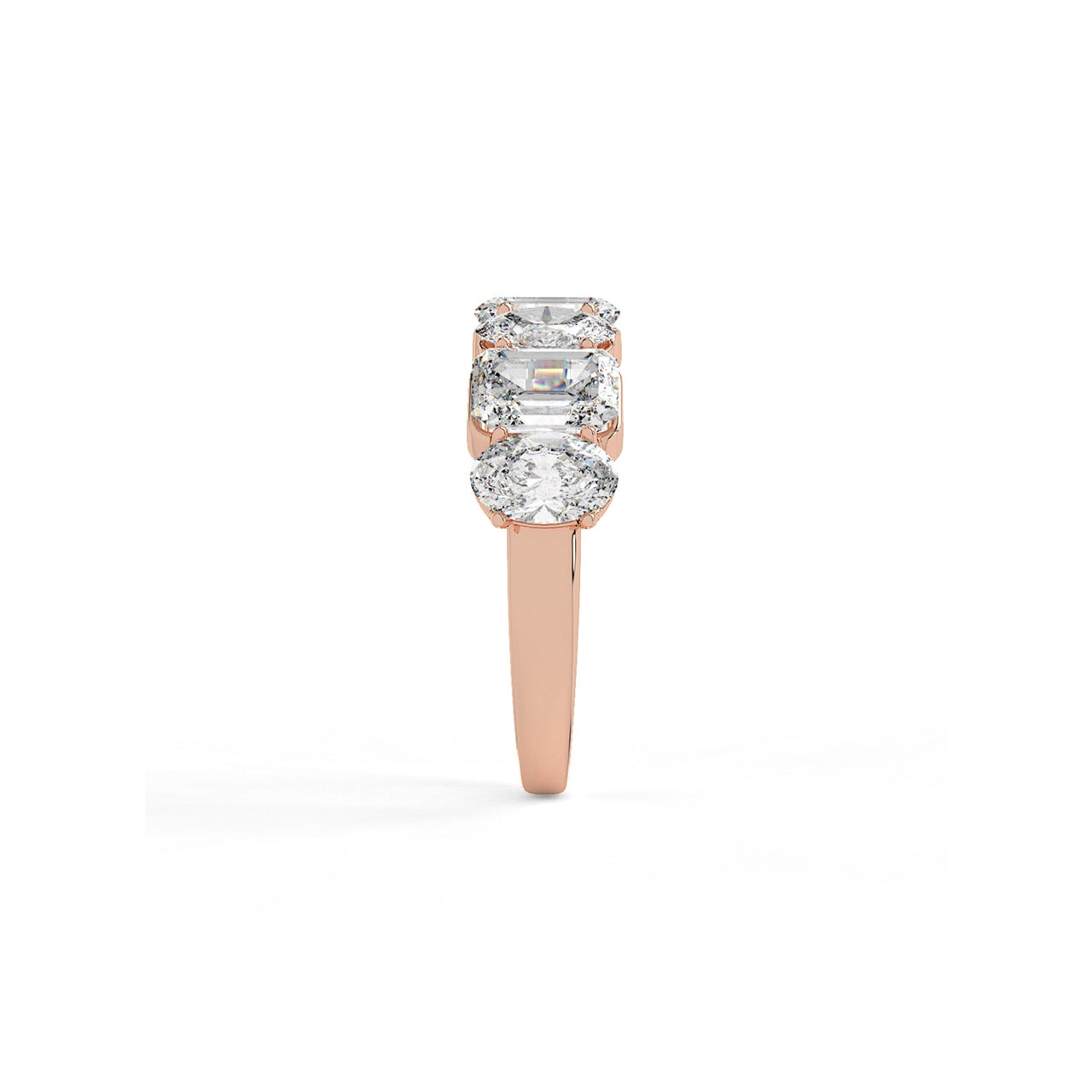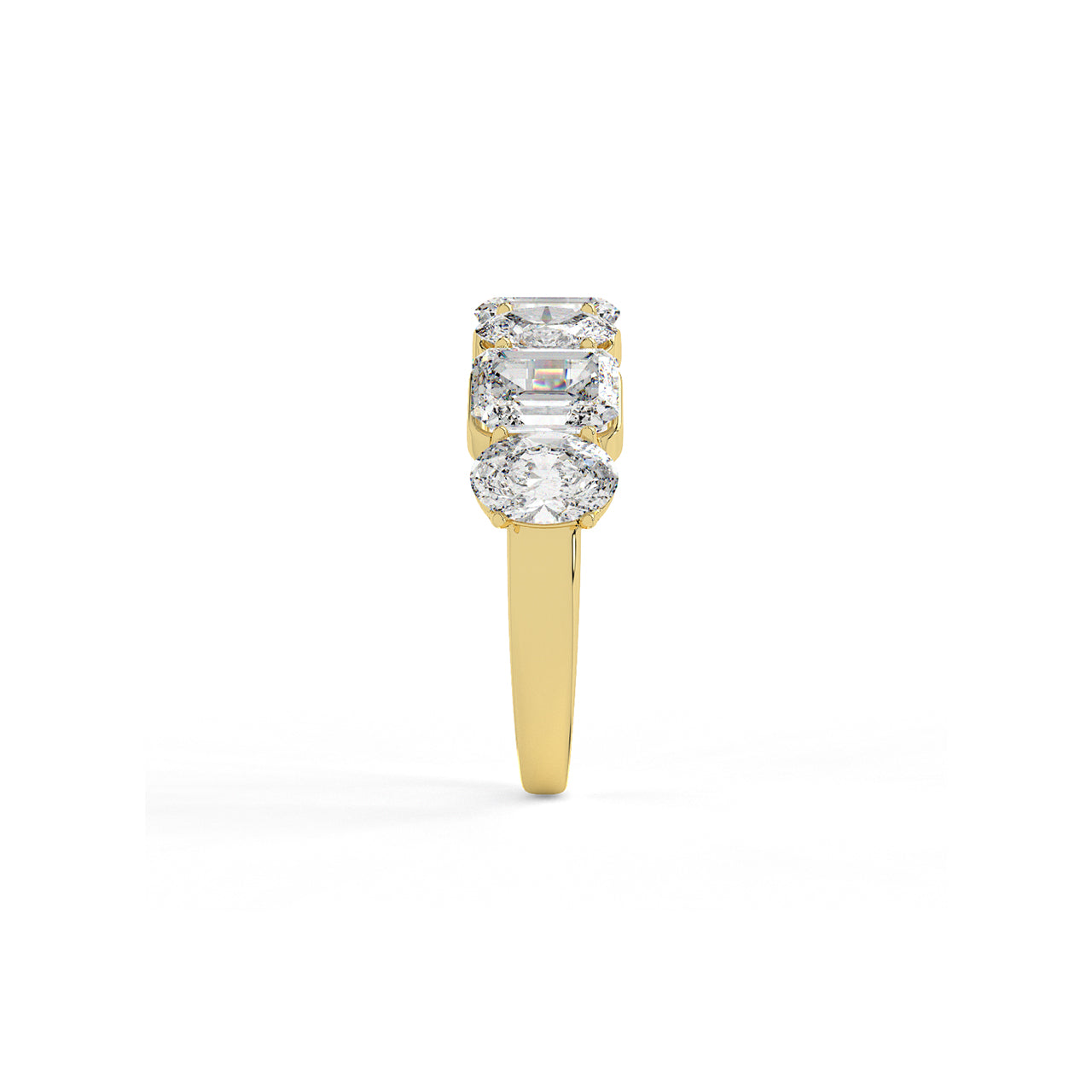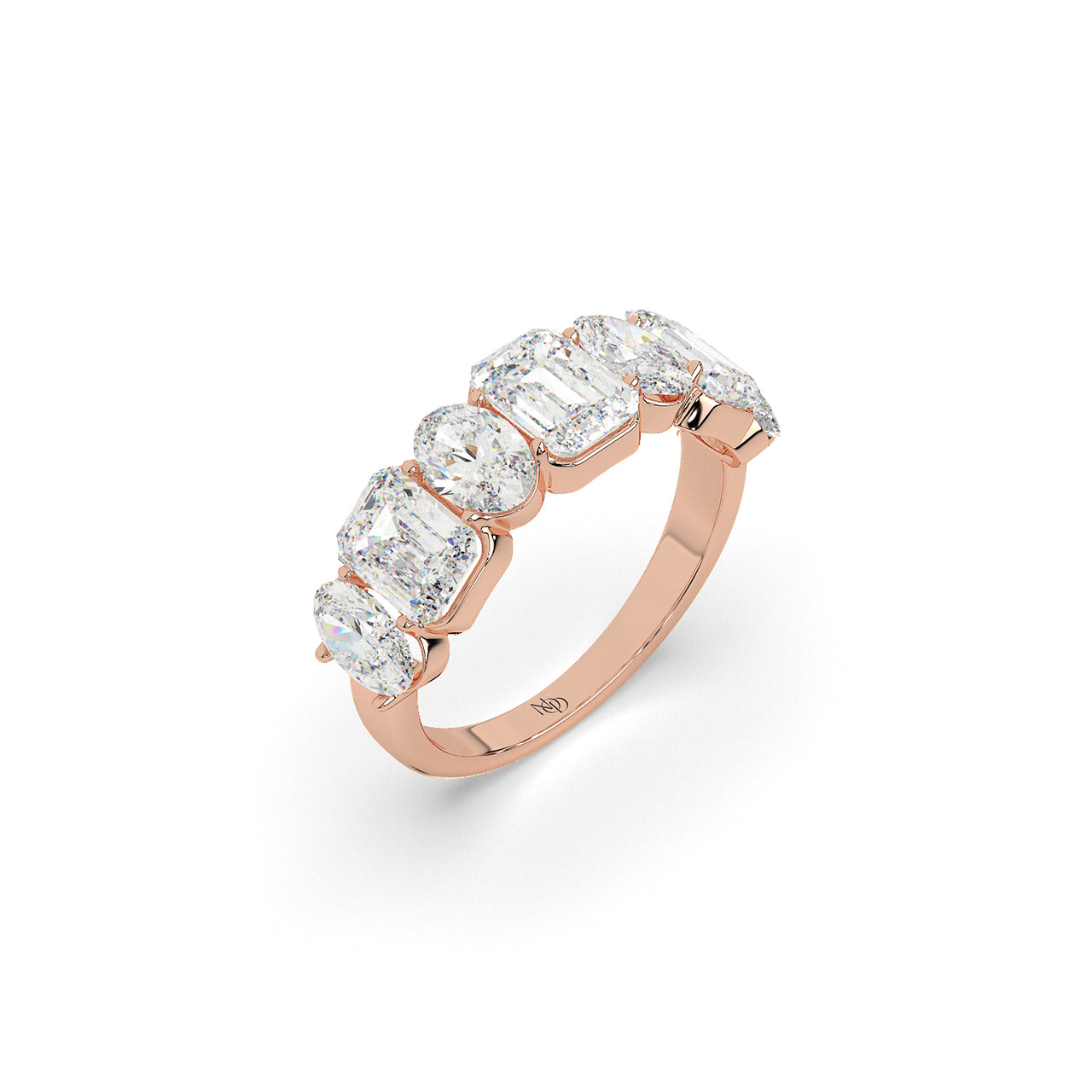 A masterclass in balance, this band features a striking arrangement of emerald and oval cut diamonds in seamless succ...