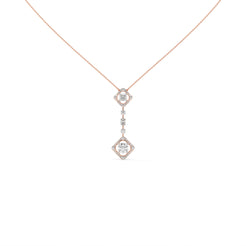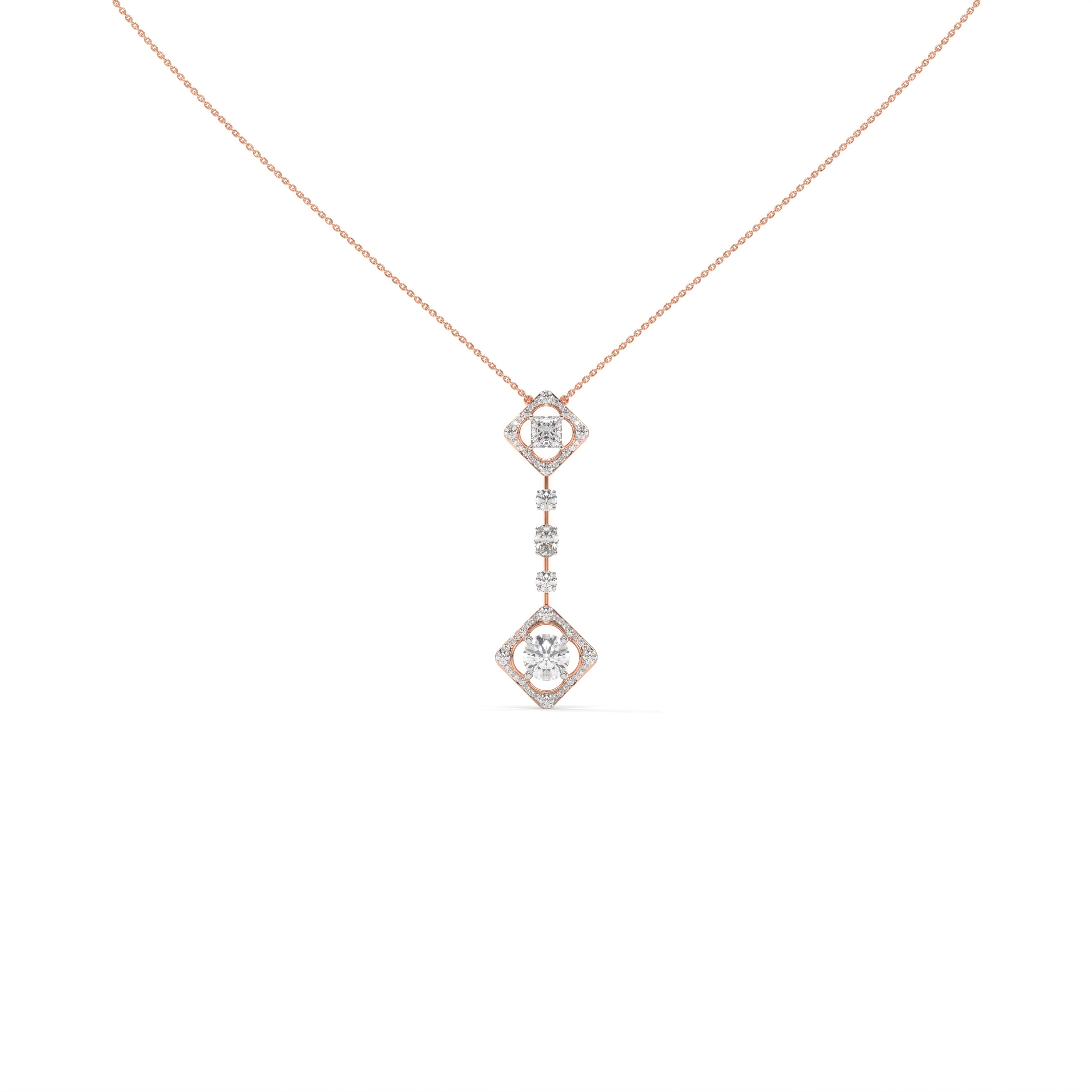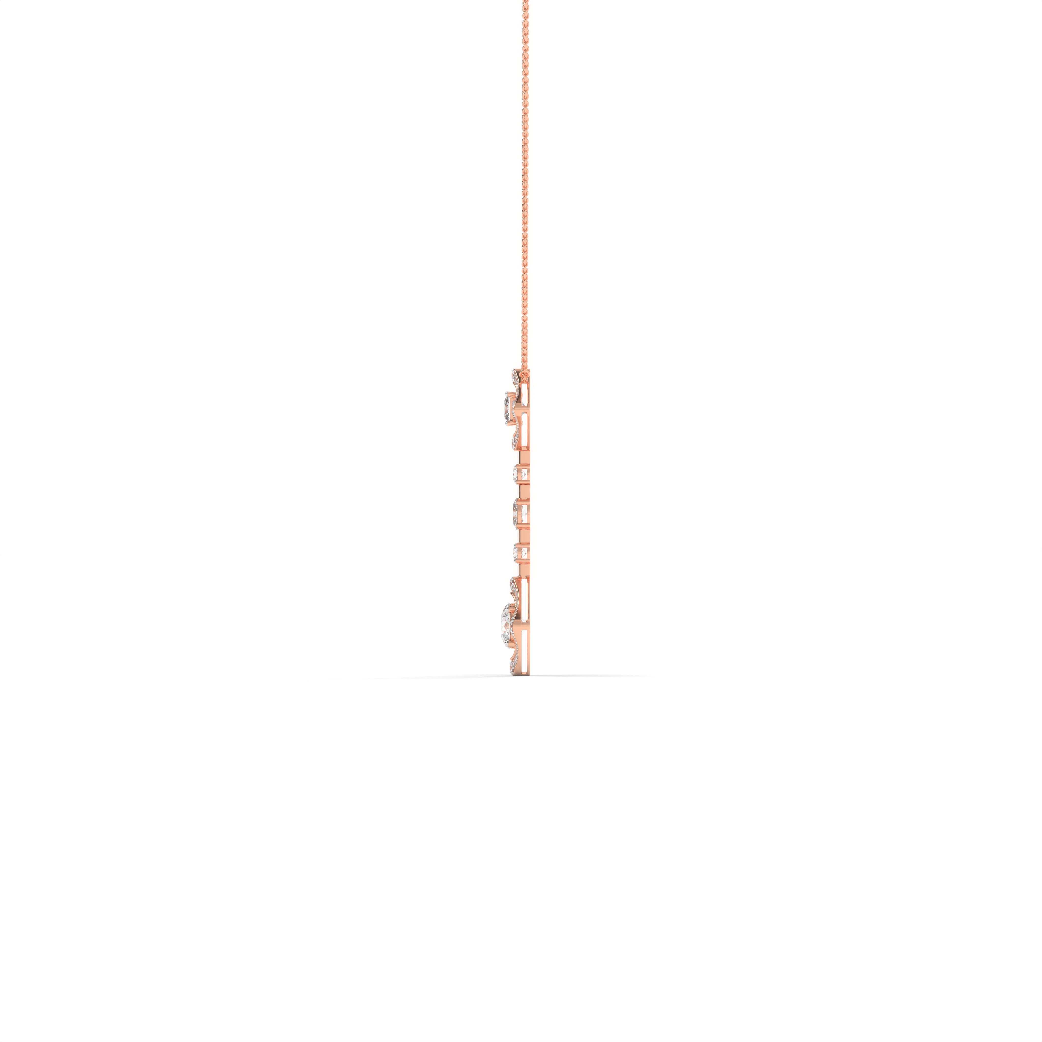 The Axis Pendant brings together symmetry and fluidity in a composition that feels both structured and alive. Two geometric frames — one at each end — hold radiant round and princess-cut lab-grown diamonds in perfect poise. Between them, a graceful vertical line of graduating diamonds connects the two forms, creating a rhythmic sense of balance and progression.