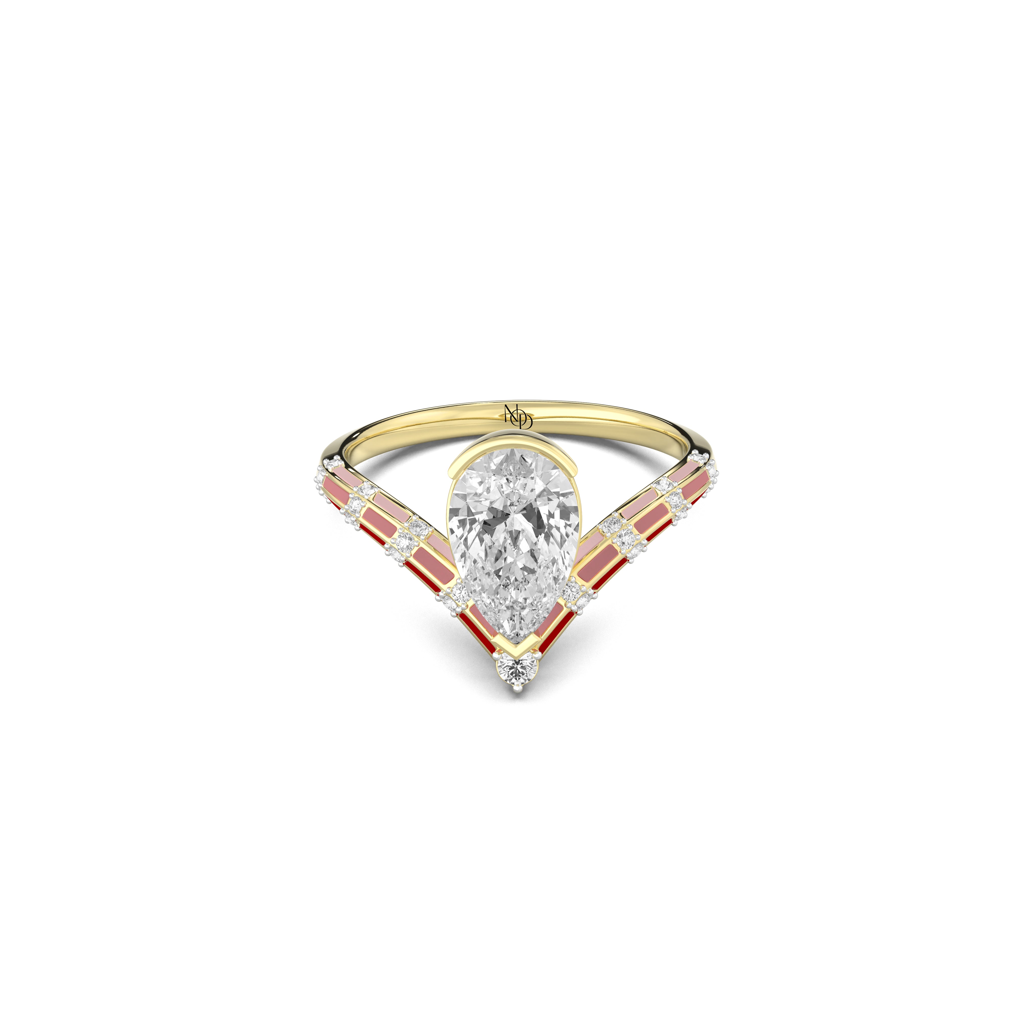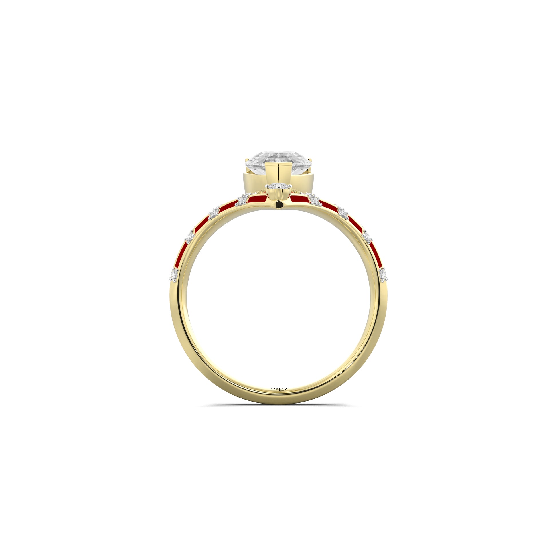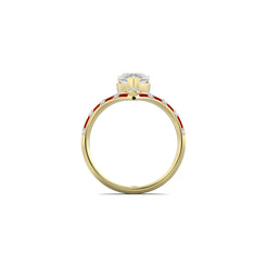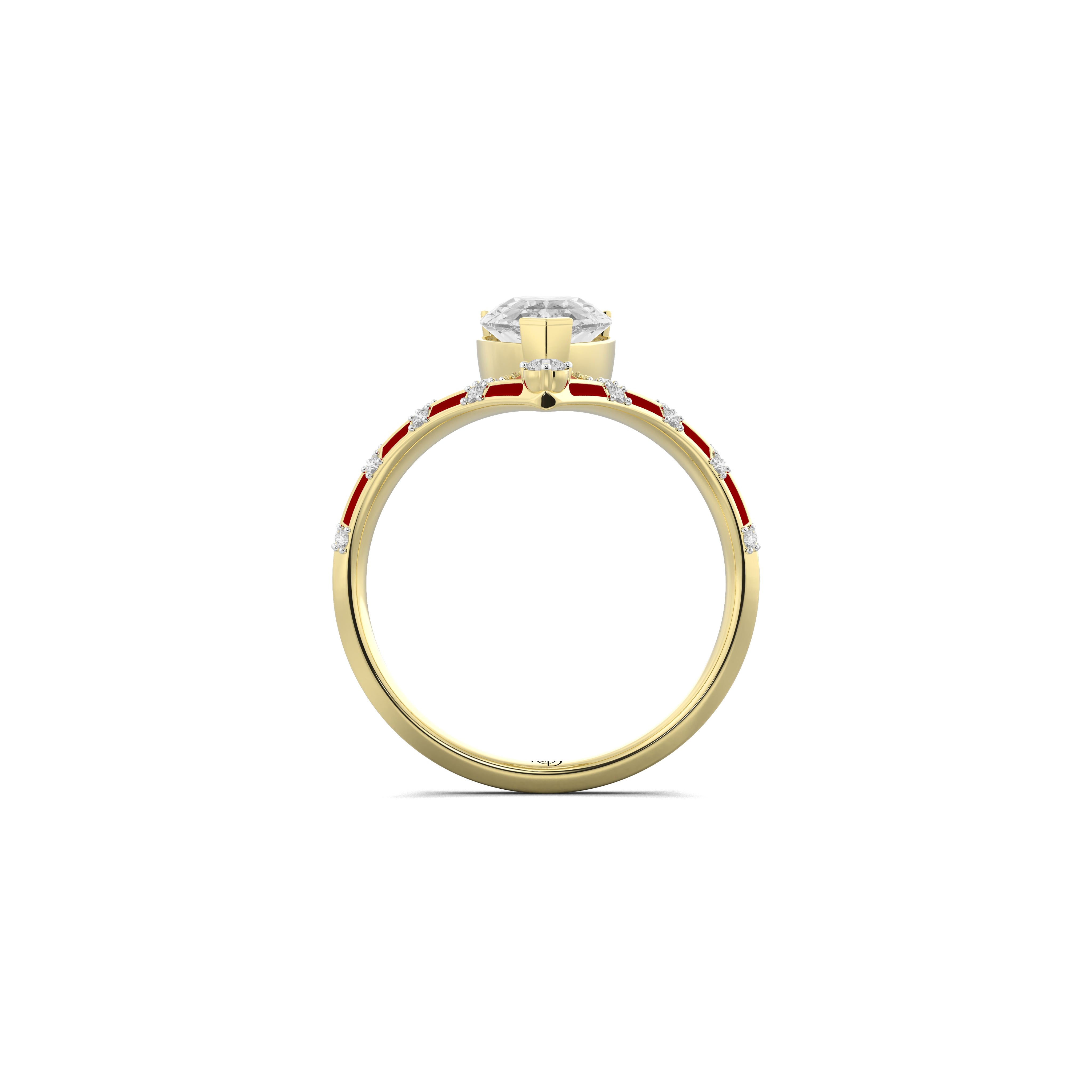 A sculpted band of gold curves around the finger, inlaid with rich red enamel that shifts between warmth and fire - a hue that symbolises her life, resilience, and the courage to stay open. At its centre, a pear shaped solitaire catches the light from every angle. It's taper echo the journey inward where clarity meets emotion.
