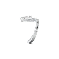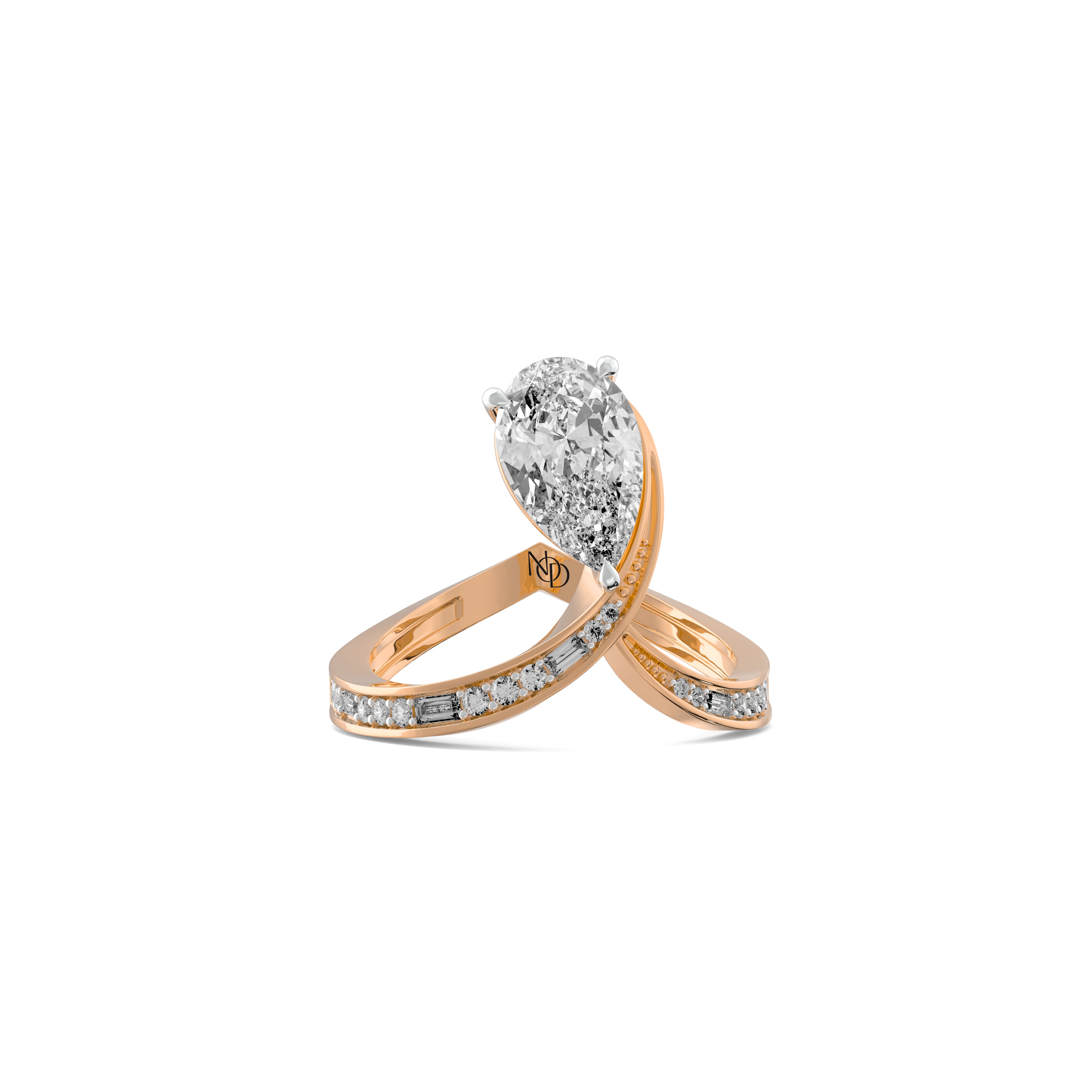 An interplay of baguette and round lab-grown diamonds curves into a soft embrace, cradling a pear-shaped solitaire at its centre.