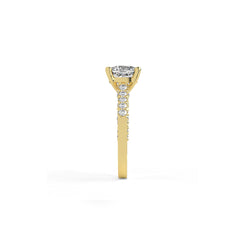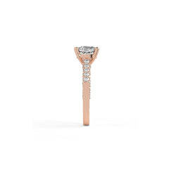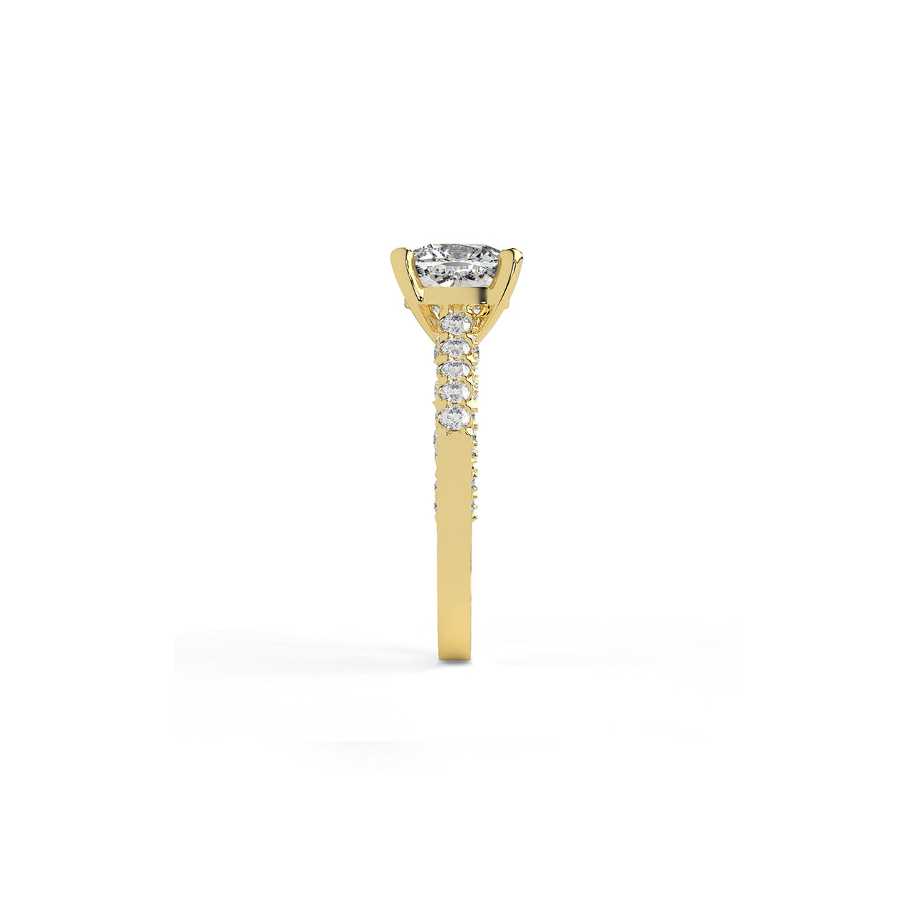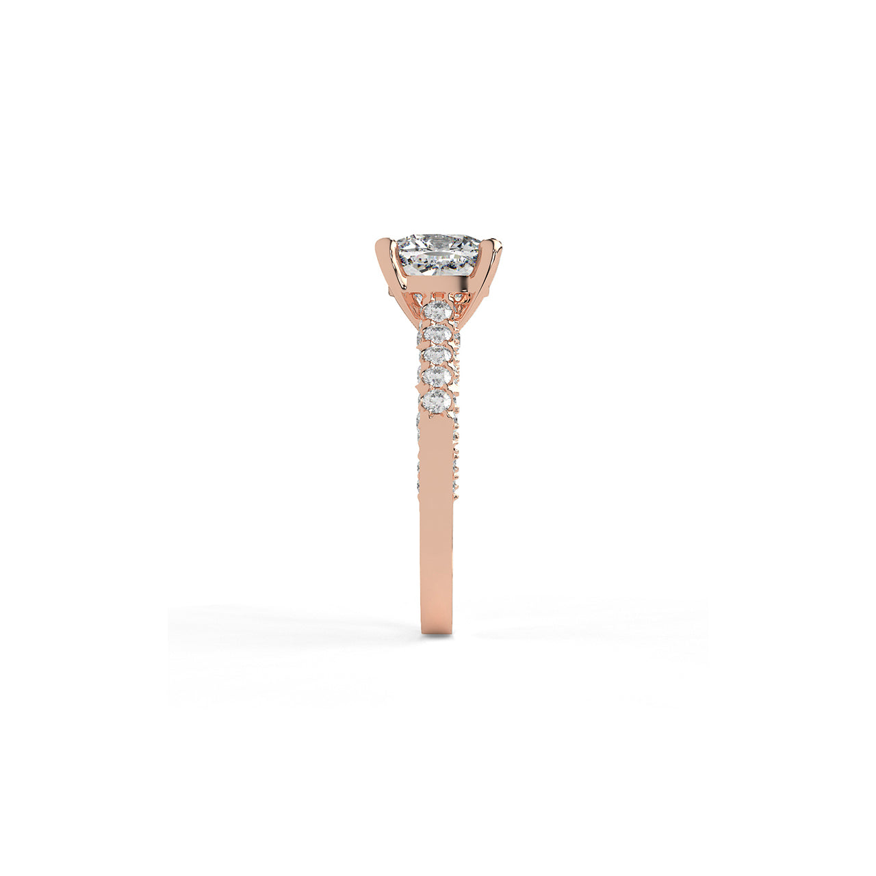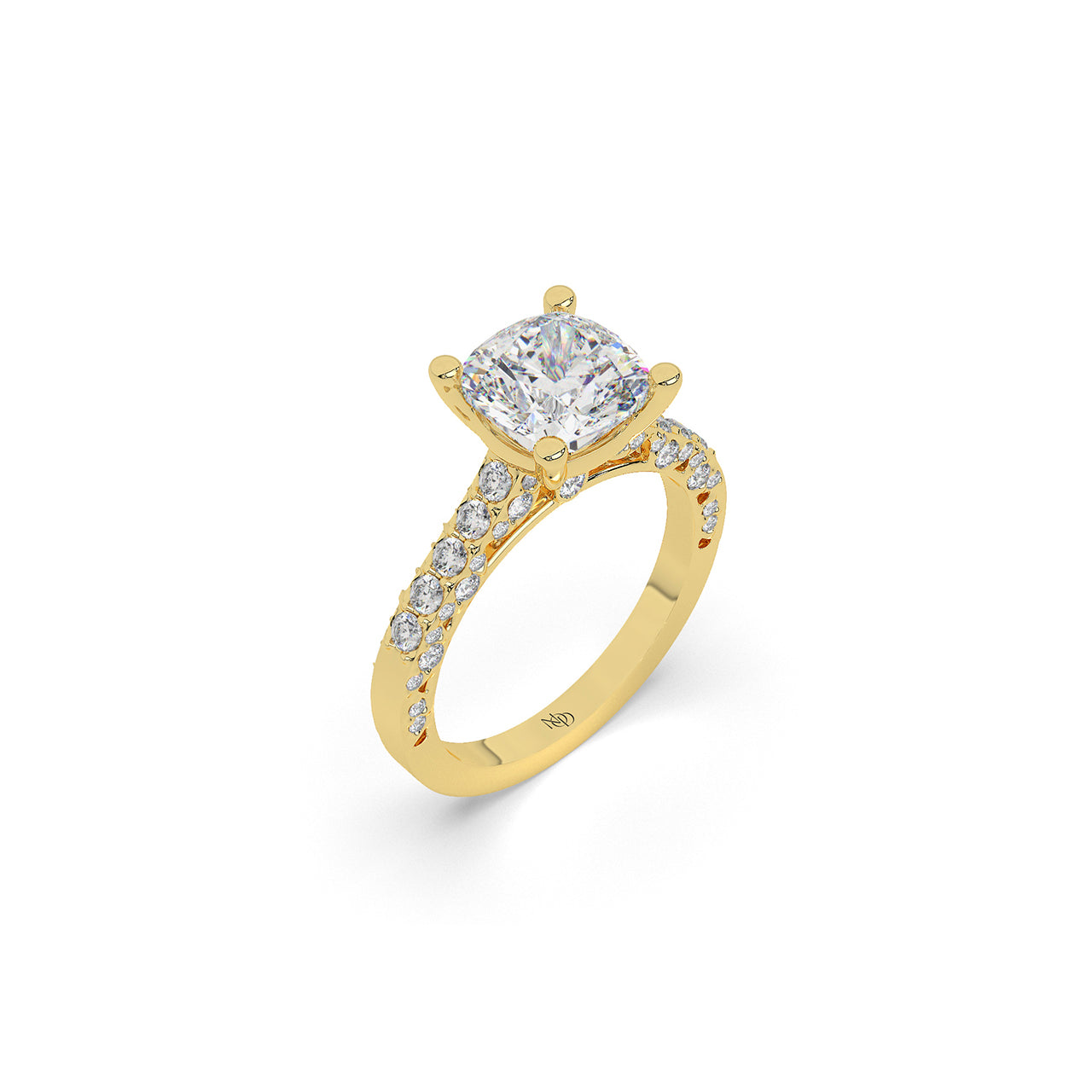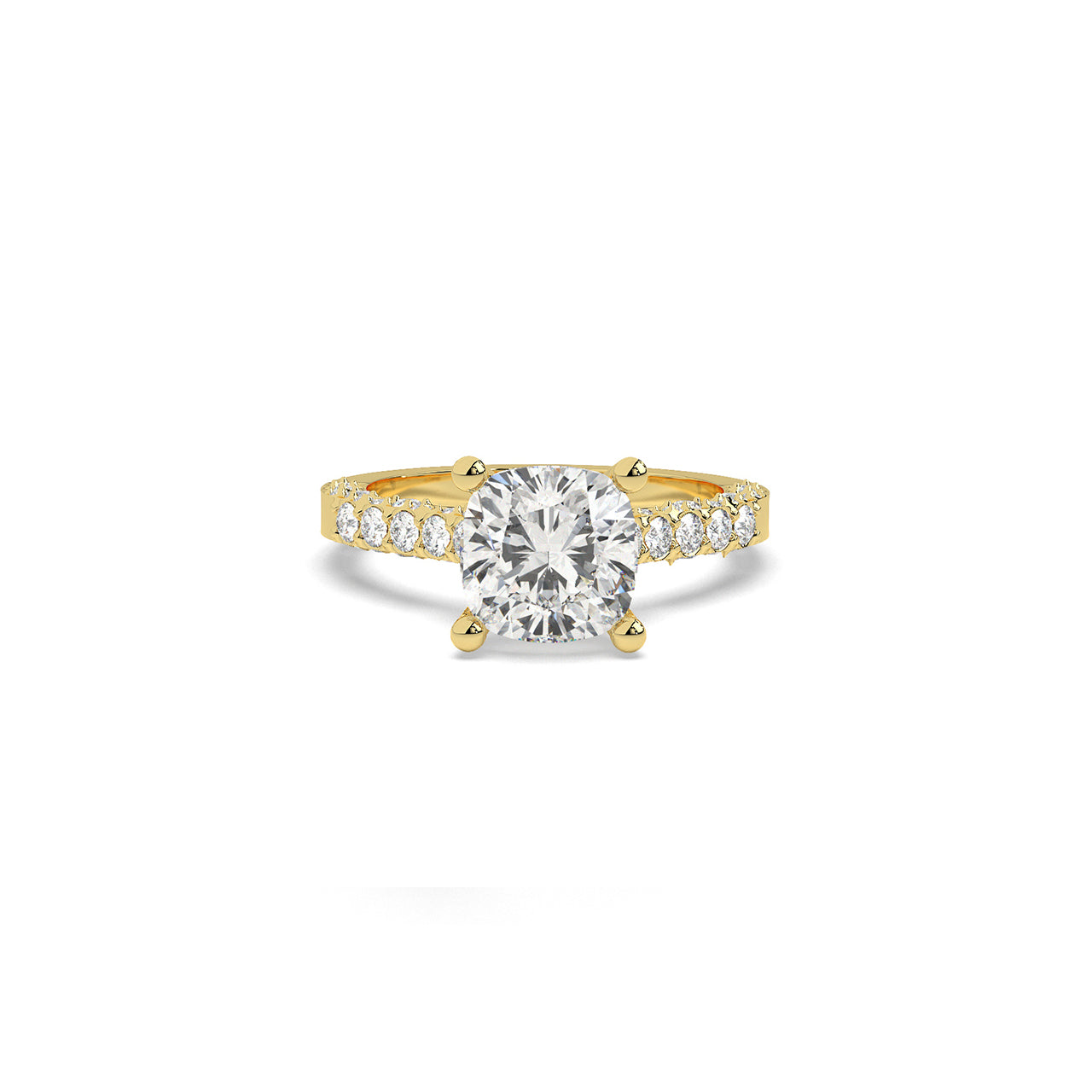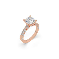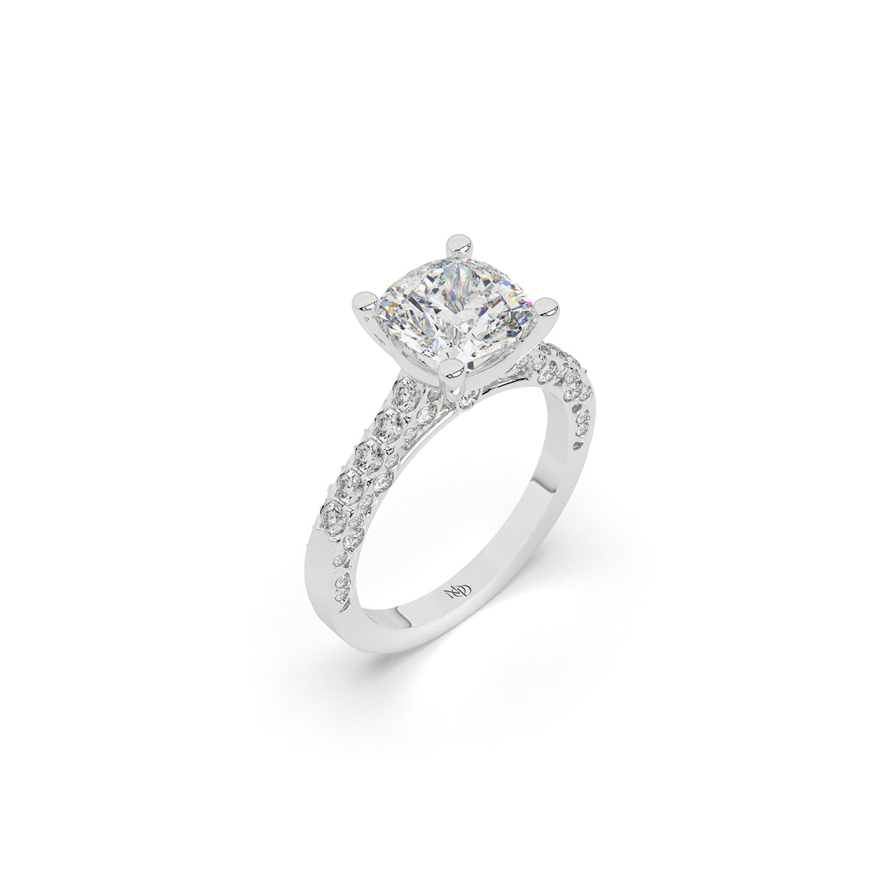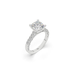 A dazzling 2 carat cushion-cut center stone takes the spotlight, set in a sleek four-prong setting atop a shimmering ...