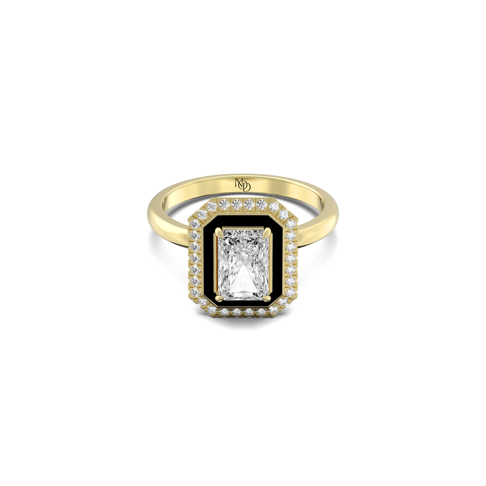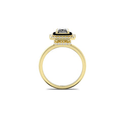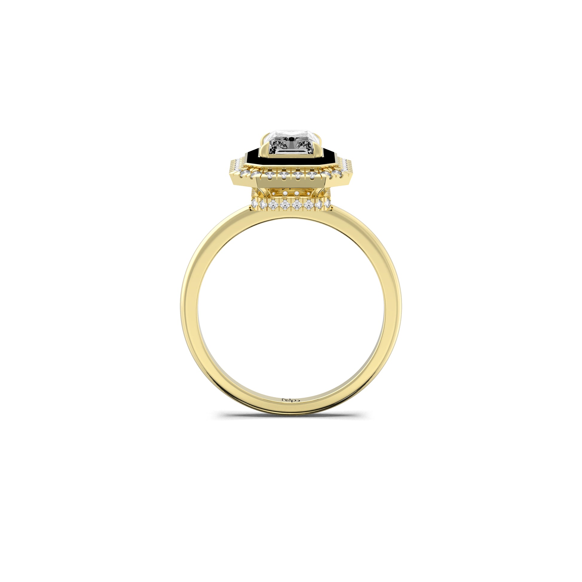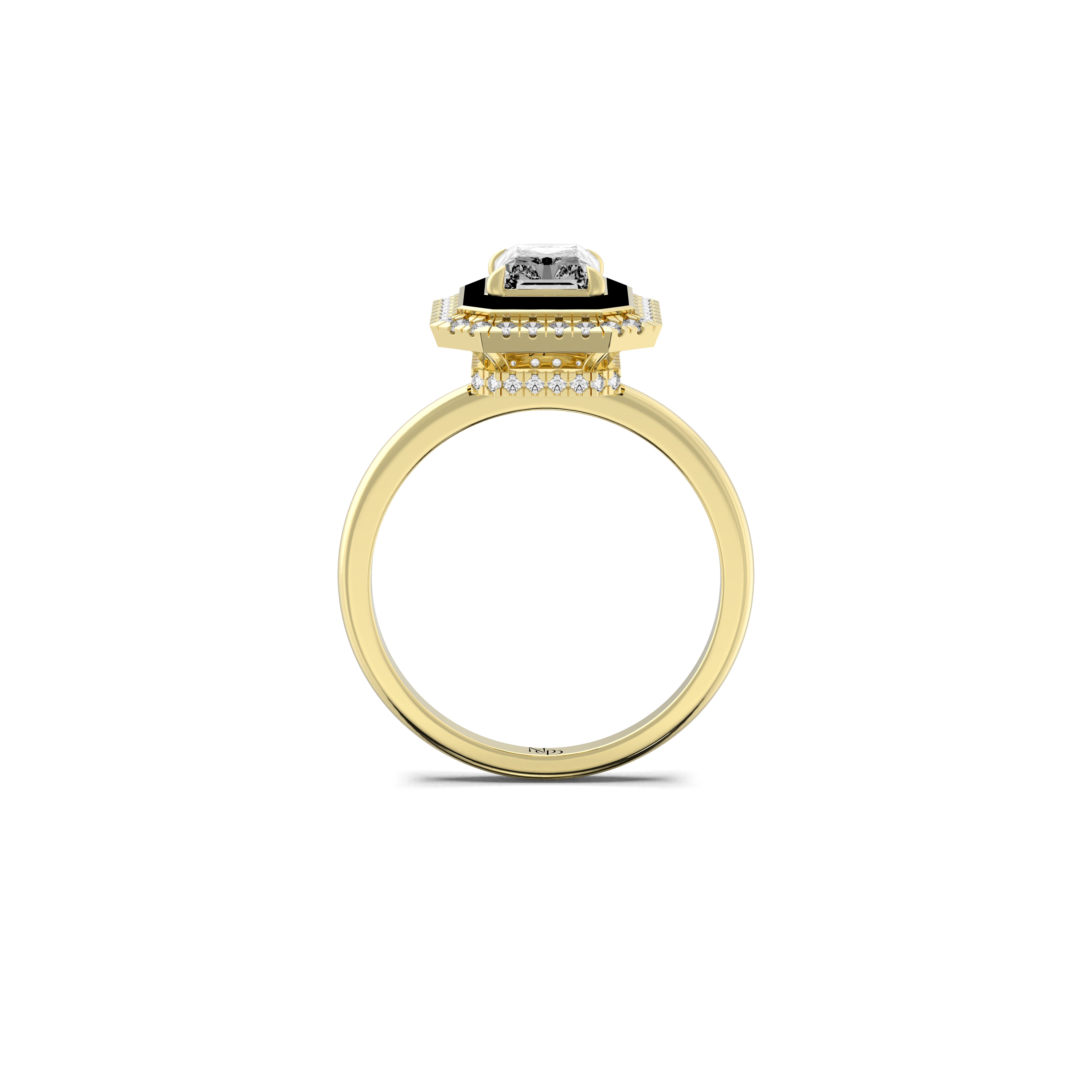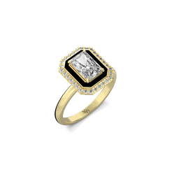 At it's centre lies a radiant cut solitaire - pure, deliberate and calm set within a bold frame of black enamel and small round grown stones. The contrast feels elemental: light and shadow, precision and flow, power and poise. Every edge, every reflection speaks the kind of her strength that needs no declaration.