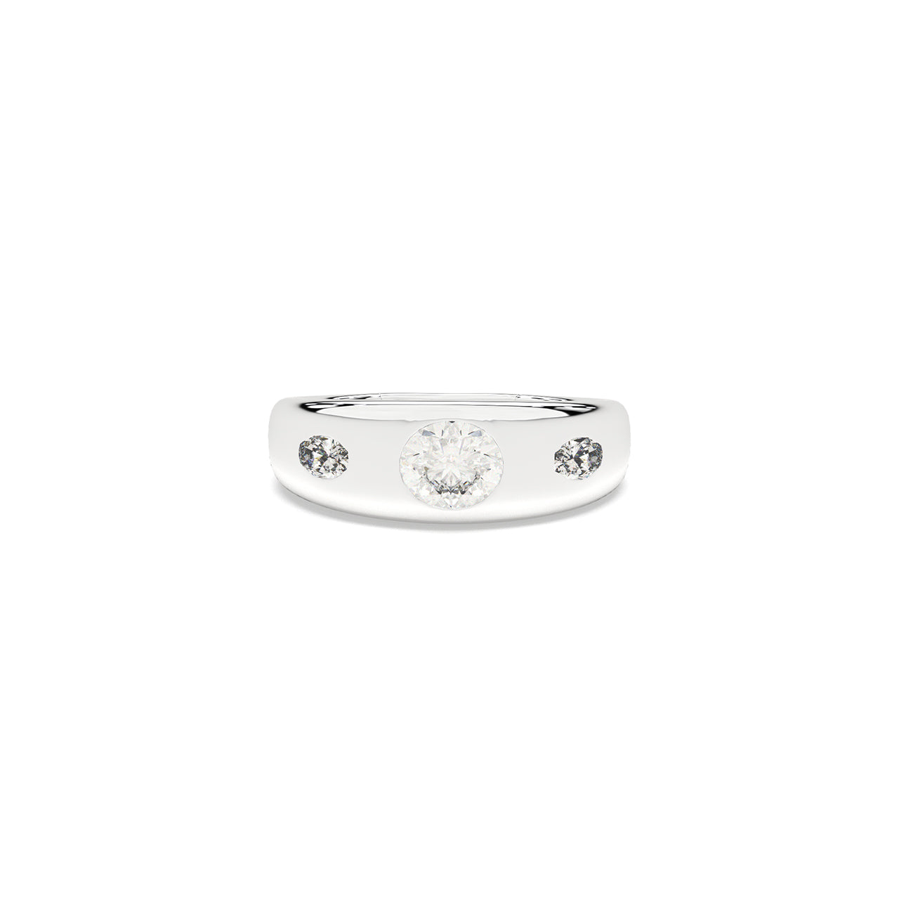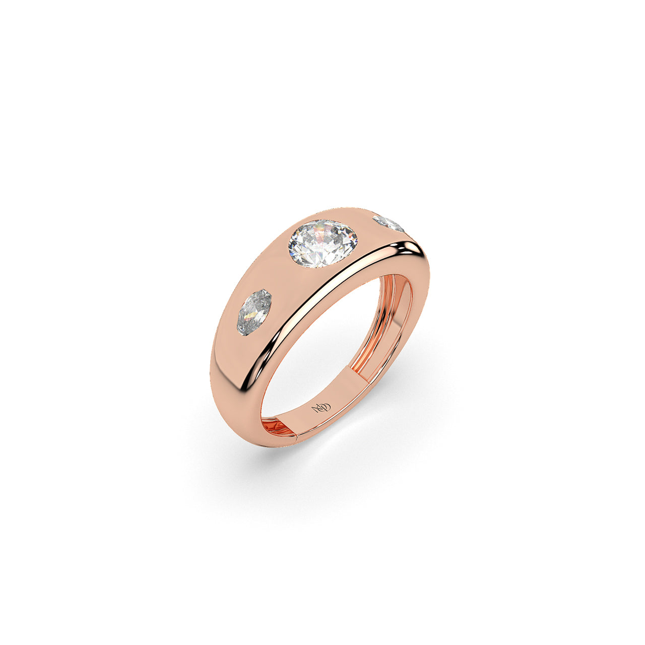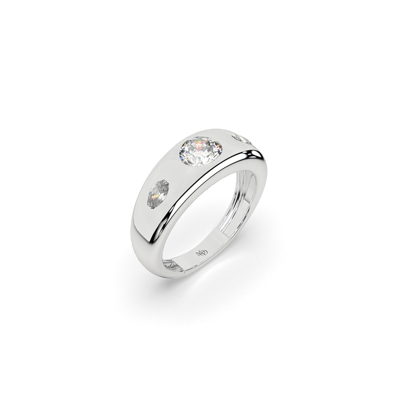 Three bezel-set diamonds nestle seamlessly into a broad, contoured band. This ring balances symmetry and variety, off...