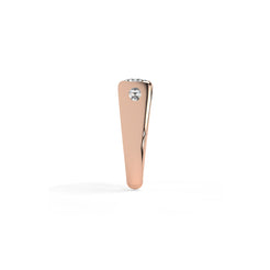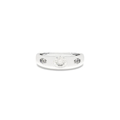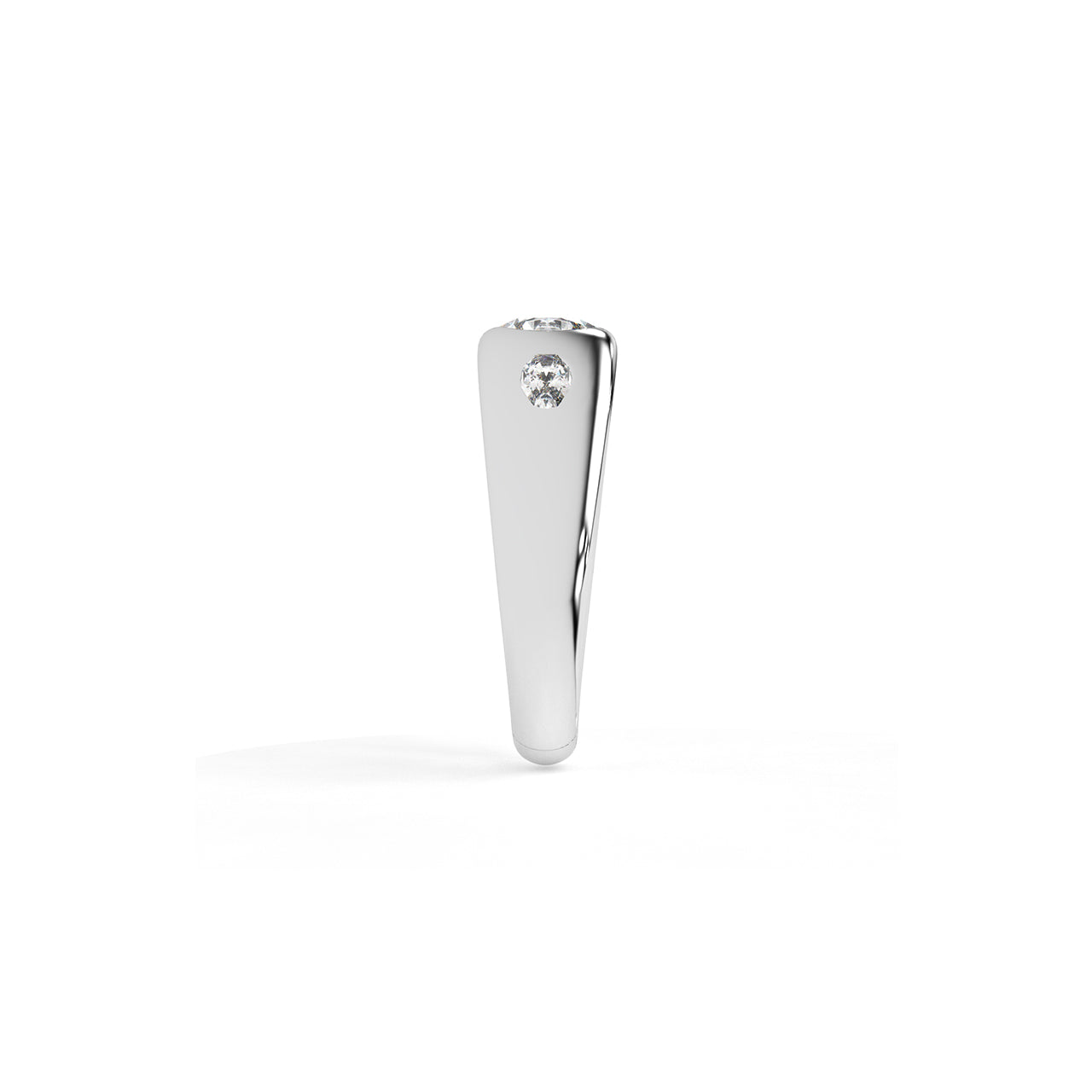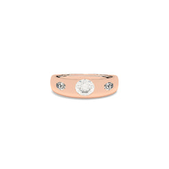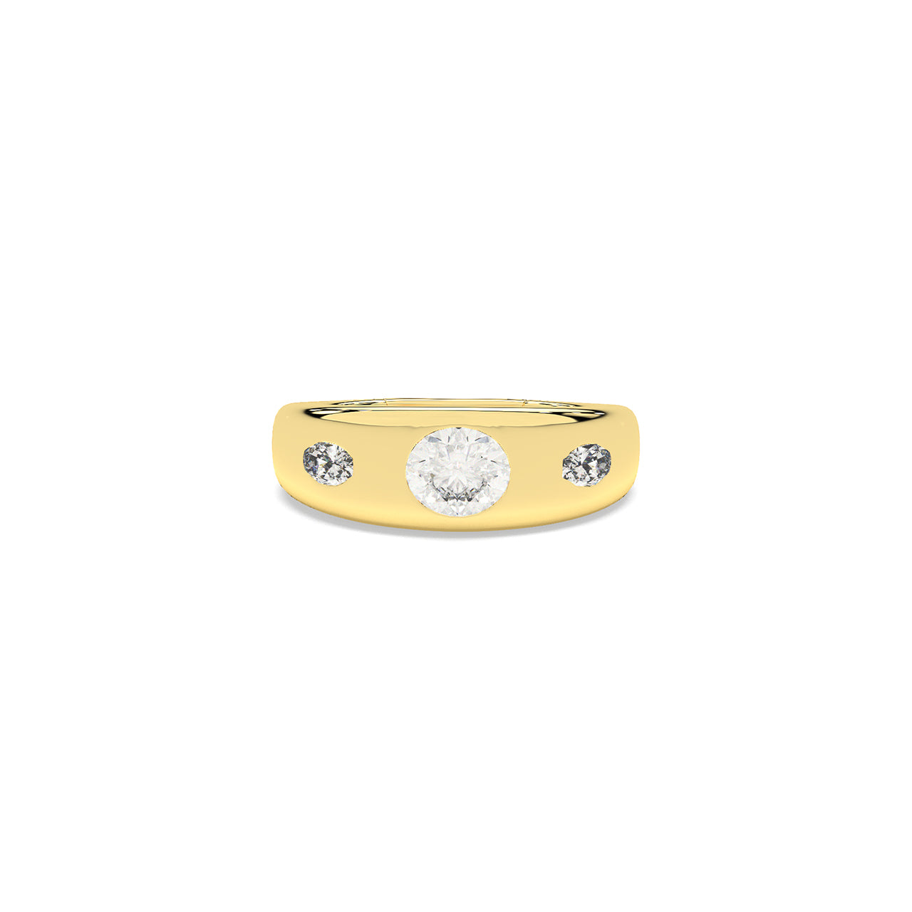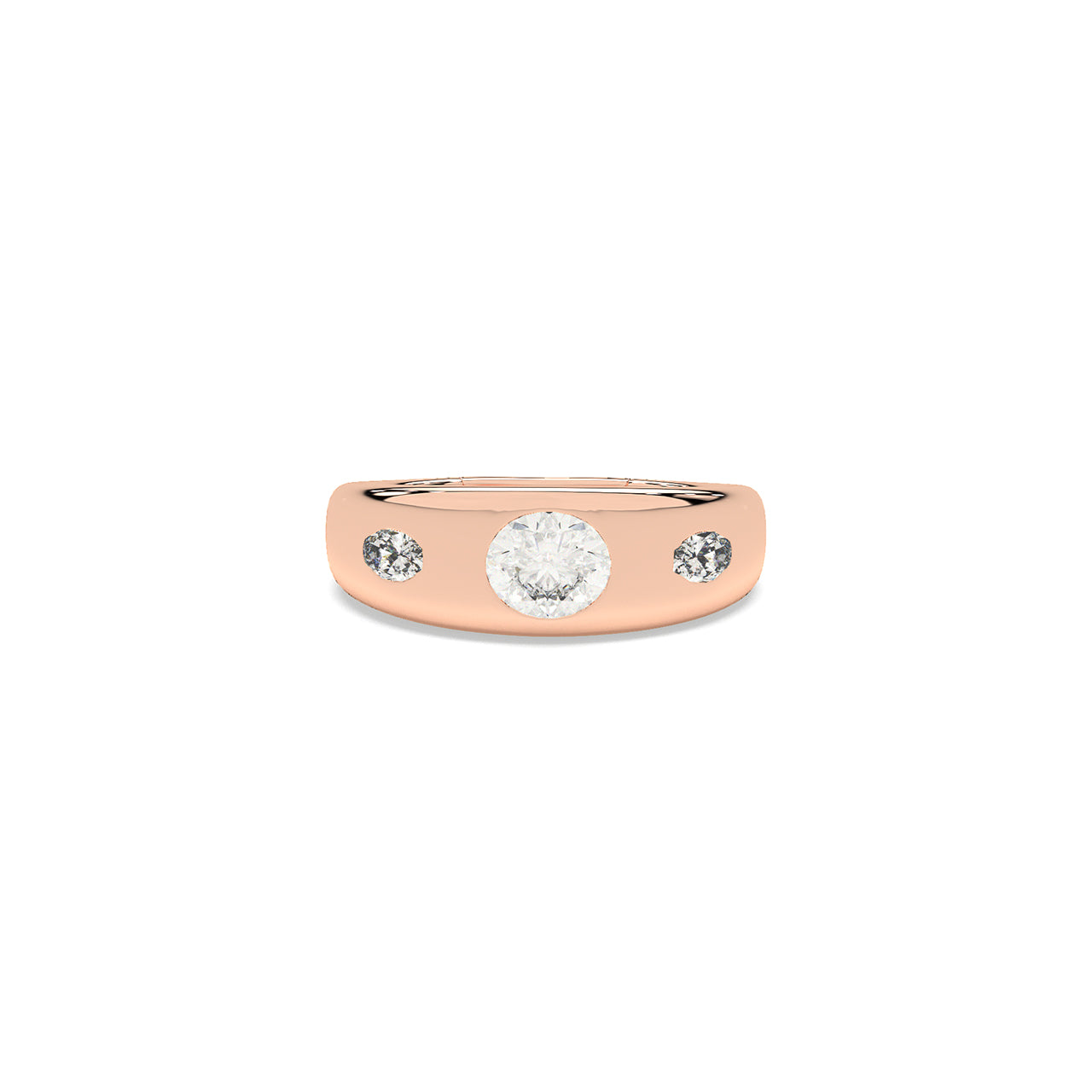 Three bezel-set diamonds nestle seamlessly into a broad, contoured band. This ring balances symmetry and variety, off...